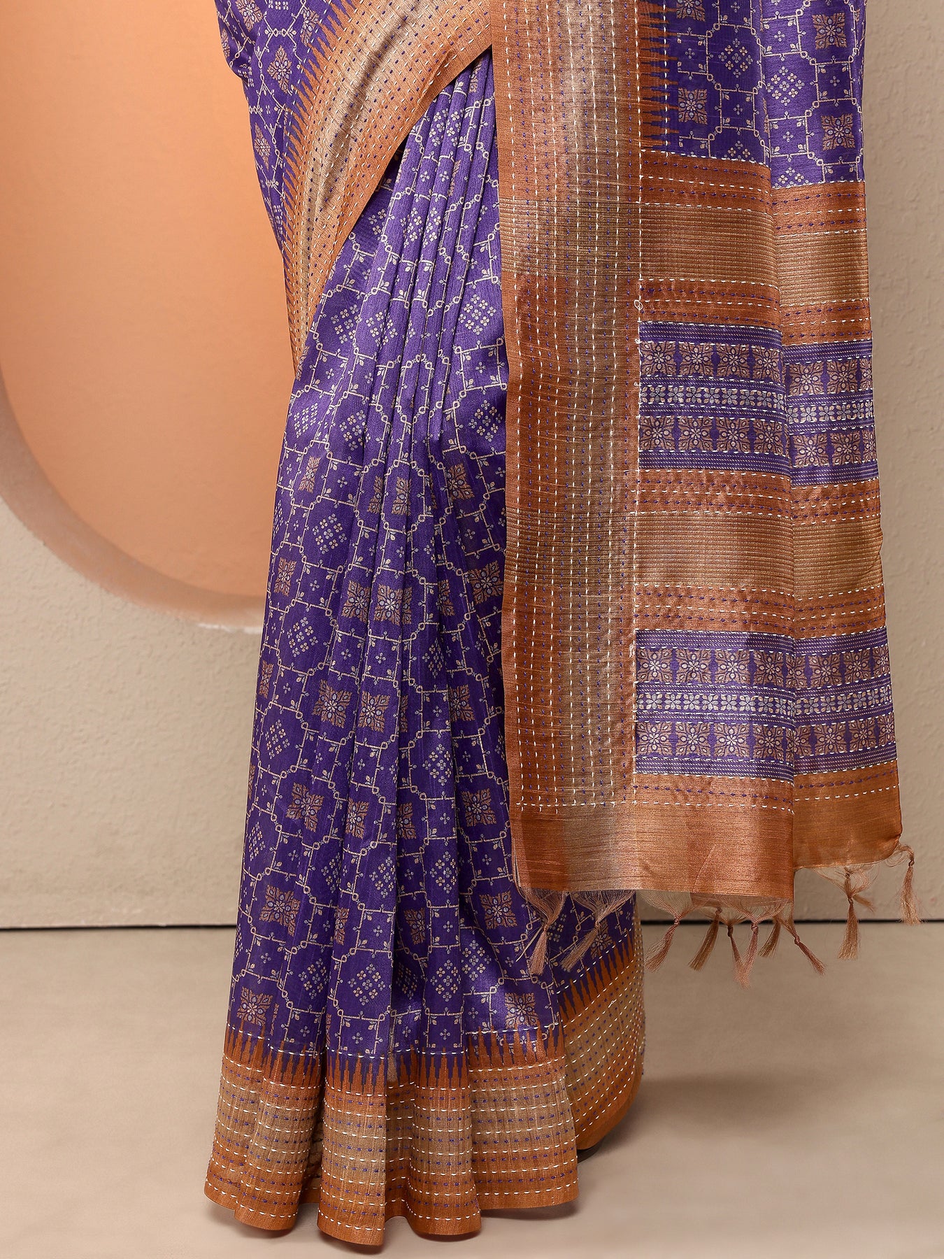 Purple Printed Silk Blend Saree With Unstitched Blouse Piece