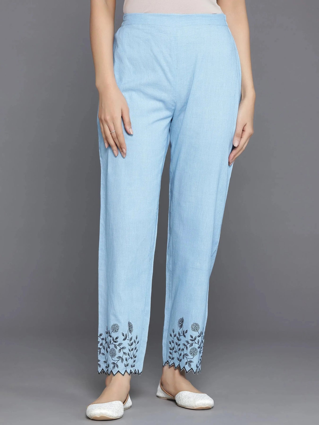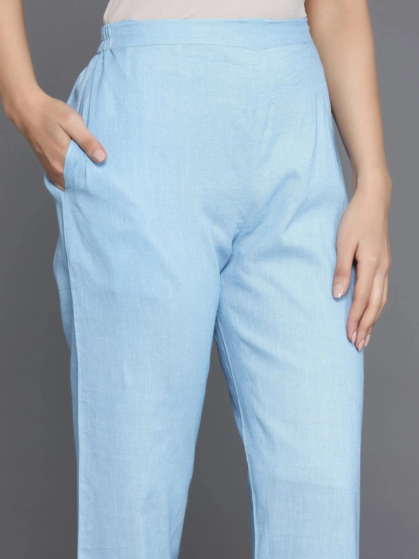 Our 3-piece blue woven design cotton suit set features a mandarin collar neckline with a buttoned-down detailing, and three-quarter sleeves. Complemented with trousers with a partially elasticated waistband and roomy pockets, and a dupatta. Adorned with stylish buttons and woven design, this style is perfect for casual outings.