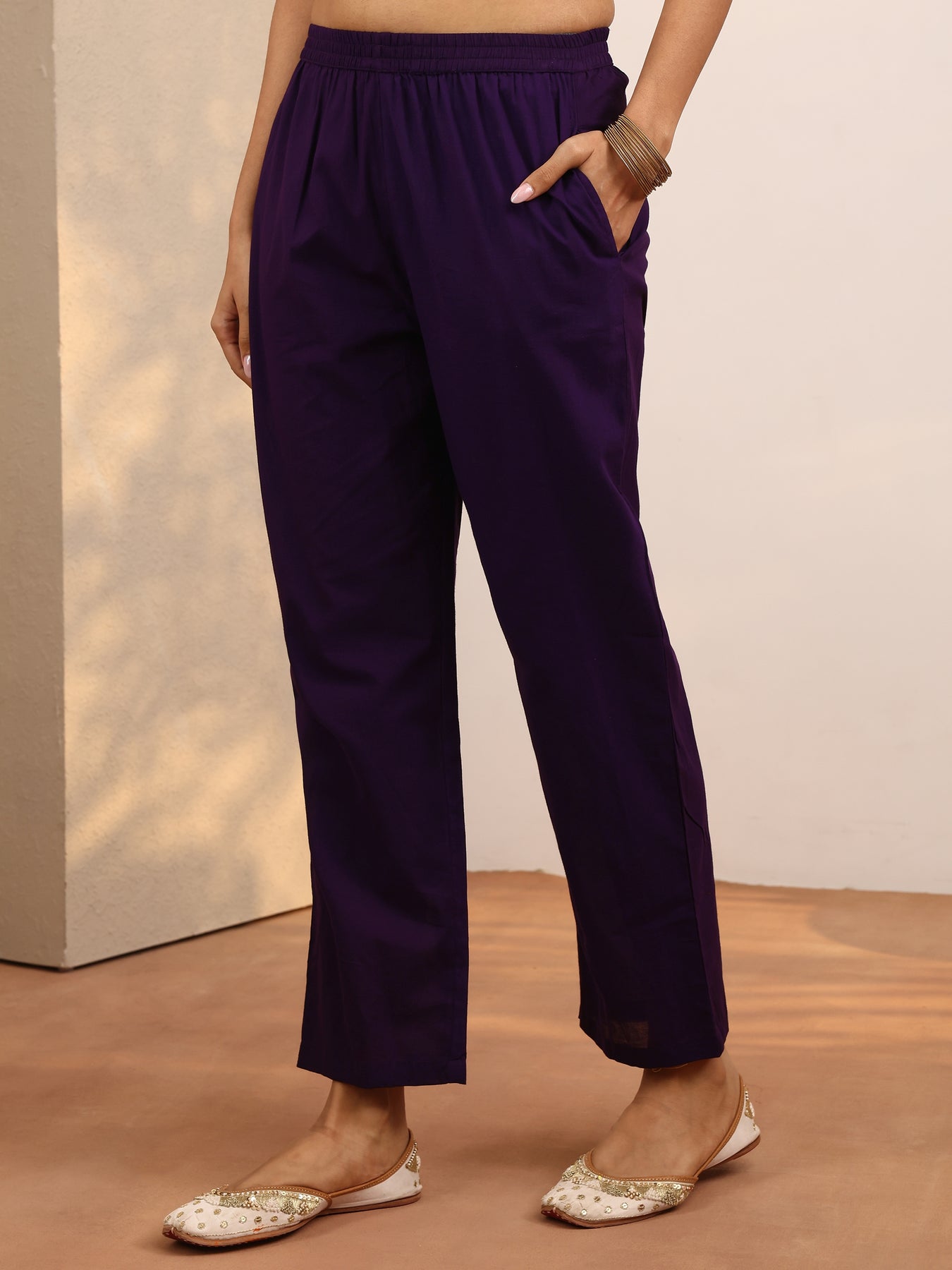 Our 3-piece purple cotton straight-fit kurta set features a V-neckline, regular sleeves, and statement yoke. Complemented with straight pants with a partially elasticated waistband and 2 pockets, and a printed dupatta. Adorned with bandhani printed, this style is perfect for dark festive occasions.