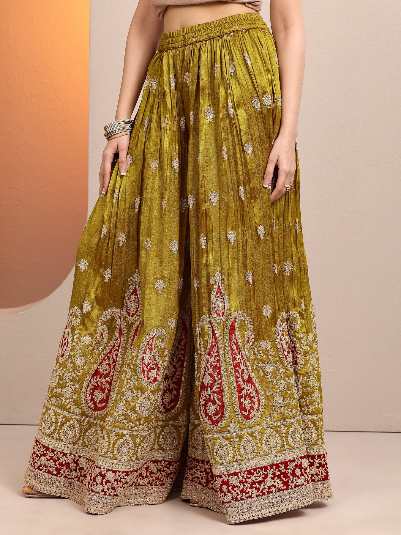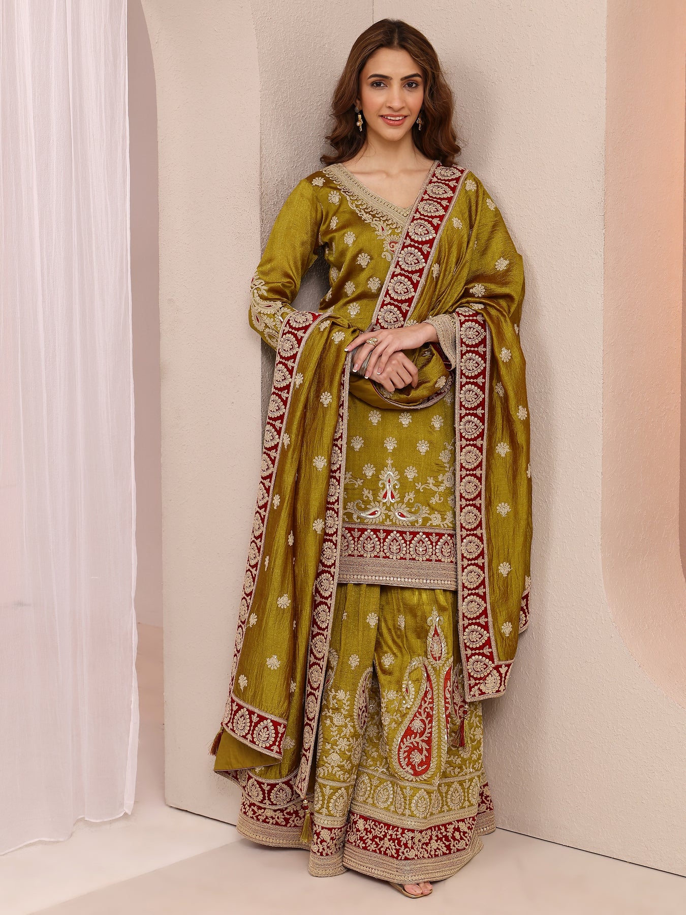 Our 3-piece green Chinon straight-fit kurta set features a V-neckline, regular sleeves, and statement yoke. Complemented with lining and sharara pants with a partially elasticated waistband, and an embroidered dupatta. Adorned with ethnic motif woven design, this style is perfect for festive occasions.