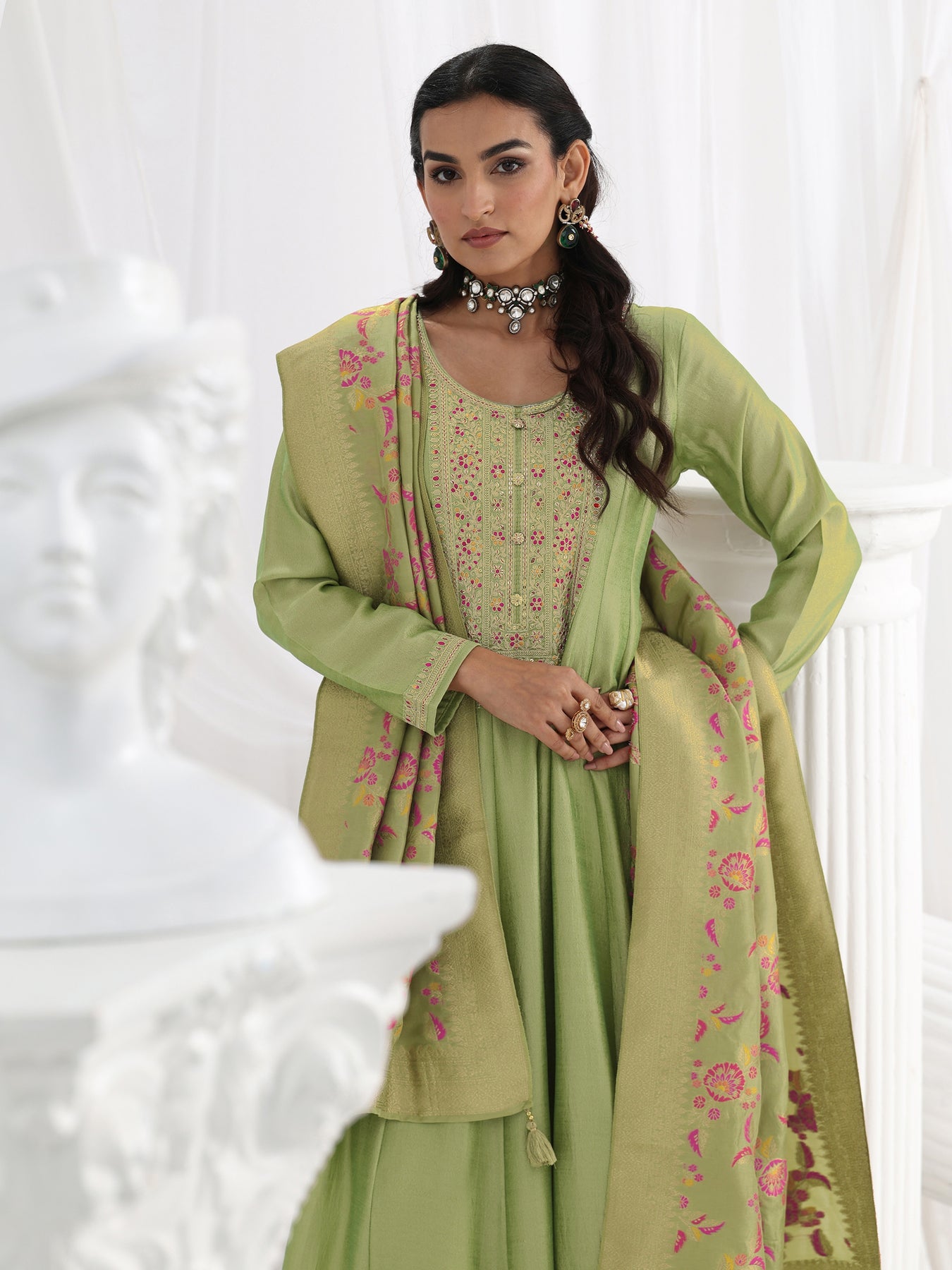 Our 3-piece Green Silk blend Anarkali Kurta Set features a Round Neckline, Regular Sleeves, and statement Yoke. Complemented with Straight Pants with a Partially Elasticated waistband and 2 pockets, and a Printed dupatta. Adorned with floral zari embroidered, this style is perfect for Festive occasions.