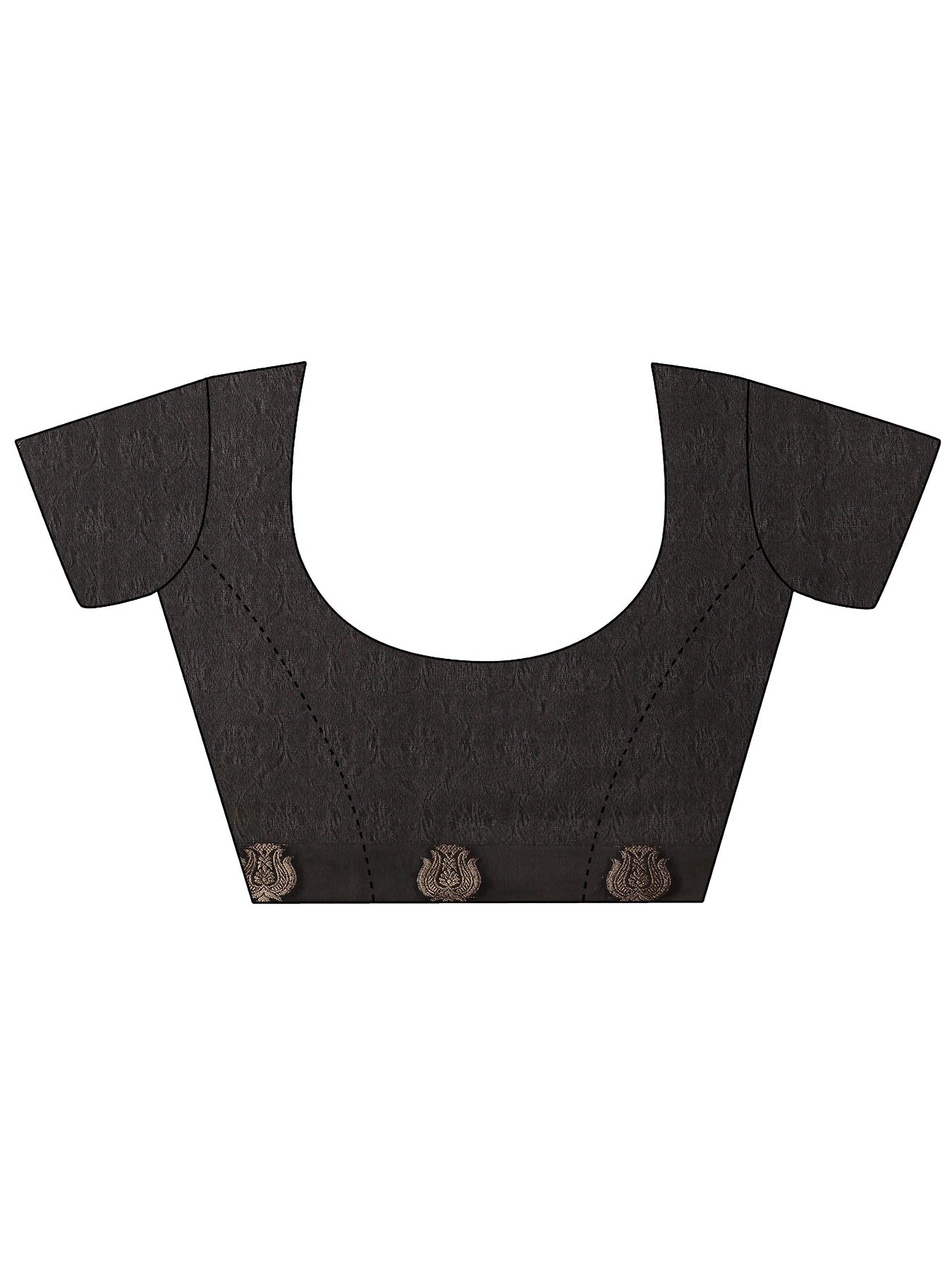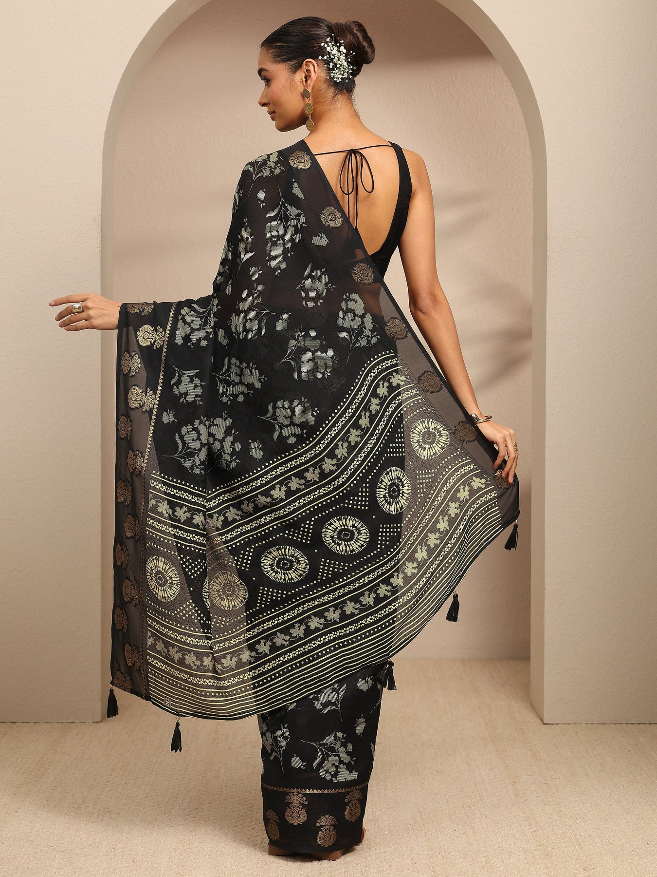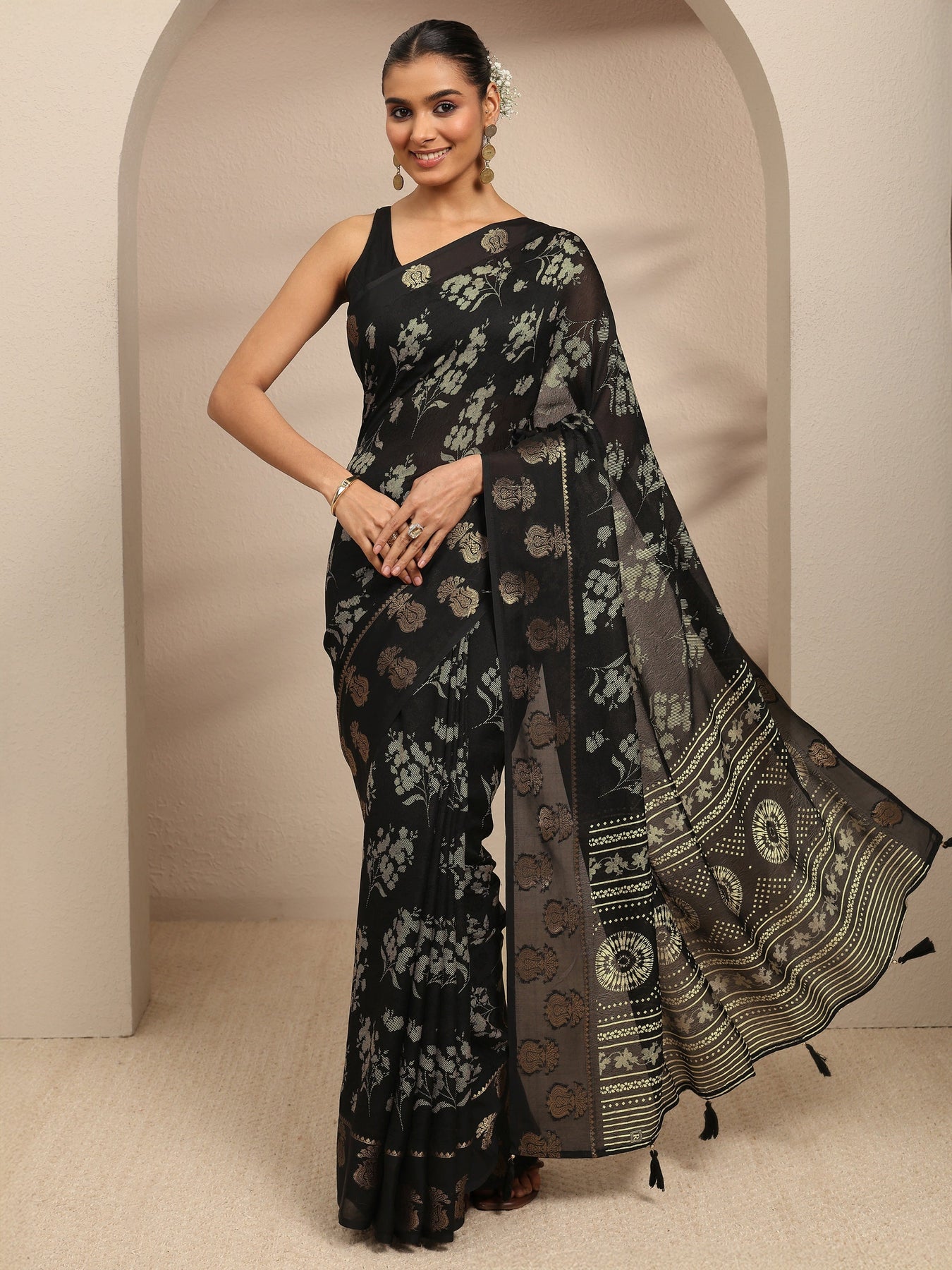 Black Floral Printed Silk Blend Saree With Unstitched Blouse Piece