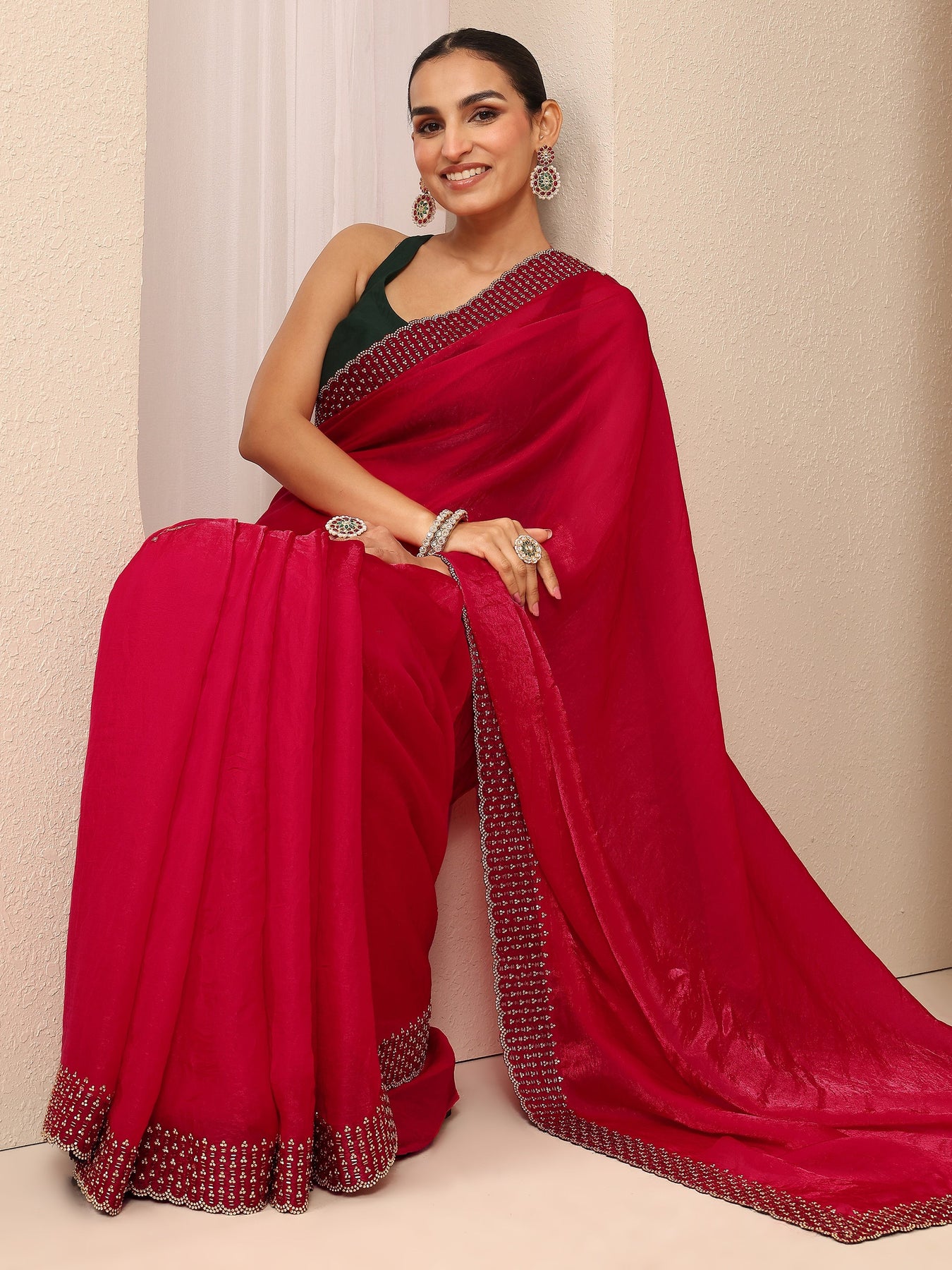 Red Solid Silk Blend Saree With Unstitched Blouse Piece