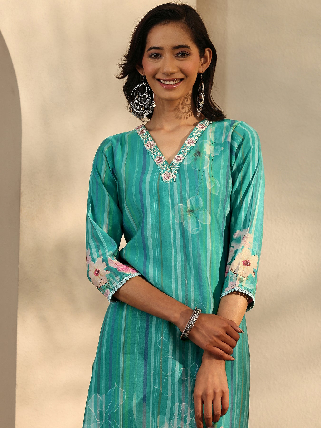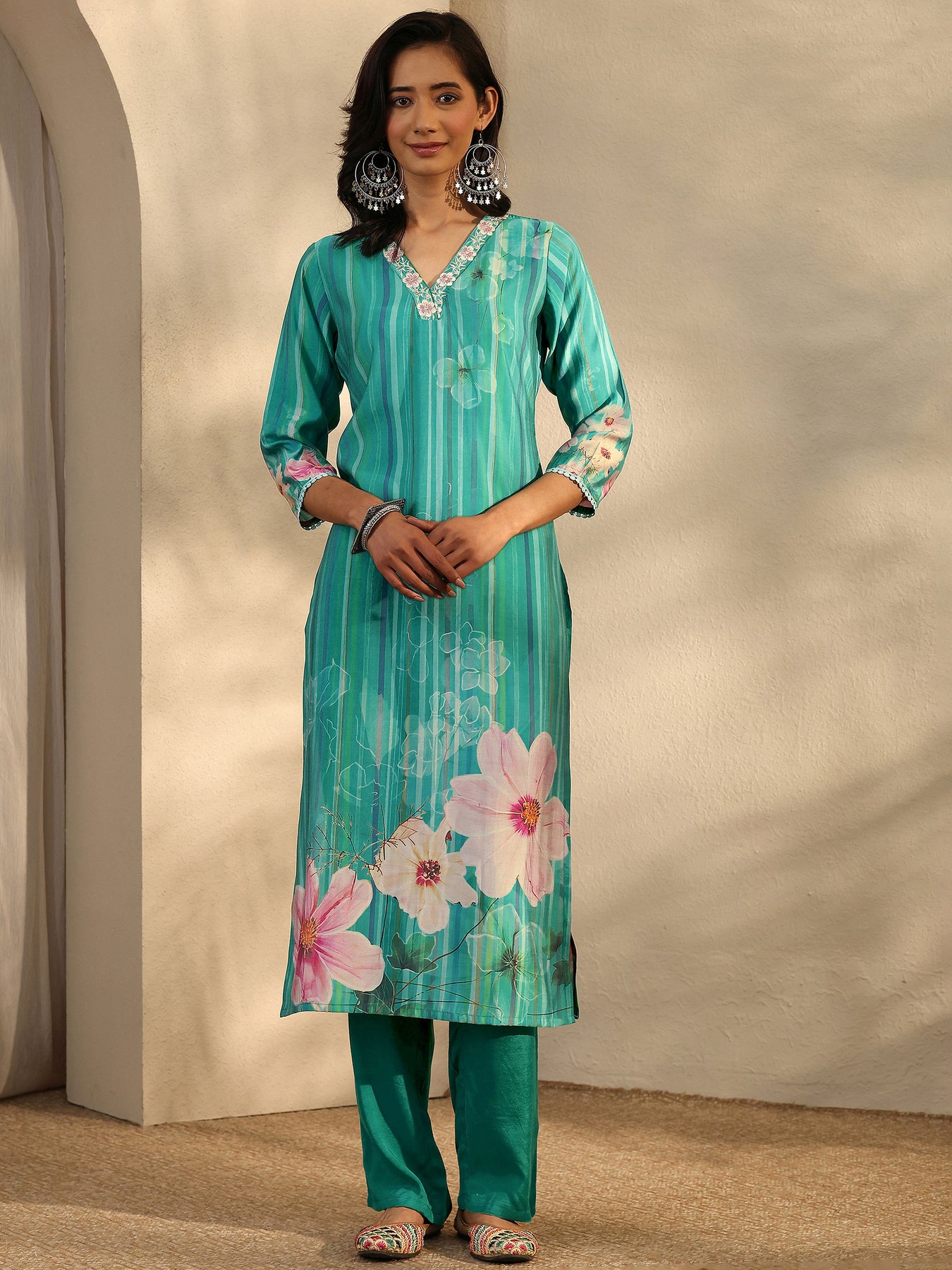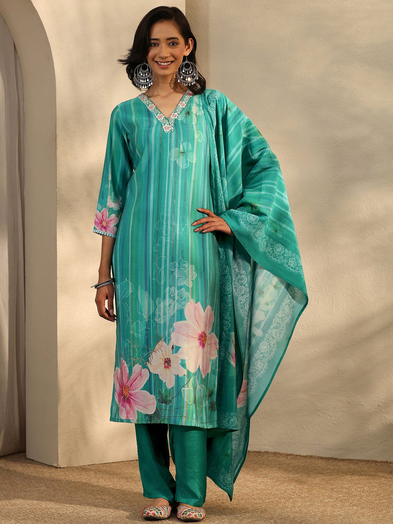 Our 3-piece teal silk blend straight-fit kurta set features a V-neckline, regular sleeves, and statement yoke. Complemented with straight pants with a partially elasticated waistband and a printed dupatta. Adorned with floral printed, this style is perfect for festive occasions.