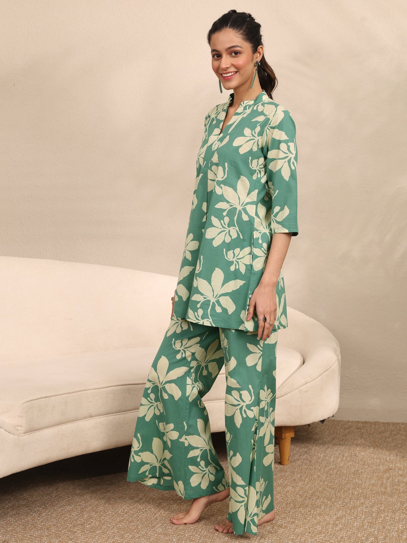 Our 2-piece Green printed Cotton nightsuit features a Straight-fit Shirt with a Shirt Collar neckline and Three-quarter sleeves. Complemented with matching Pyjamas with Partially Elasticated waistband and 2 pockets. Elevated with Top Print, this style is perfect for Night Wear.