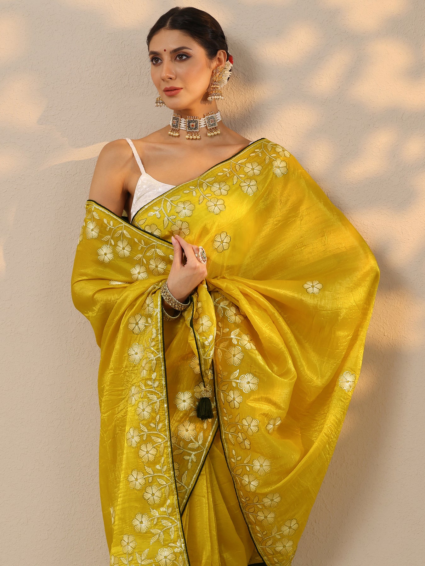 Our Yellow Printed Organza Saree Features Captivating Floral Print. Complemented With An Unstitched Blouse Piece. This Charming Saree Is Perfect For Festive Occasions