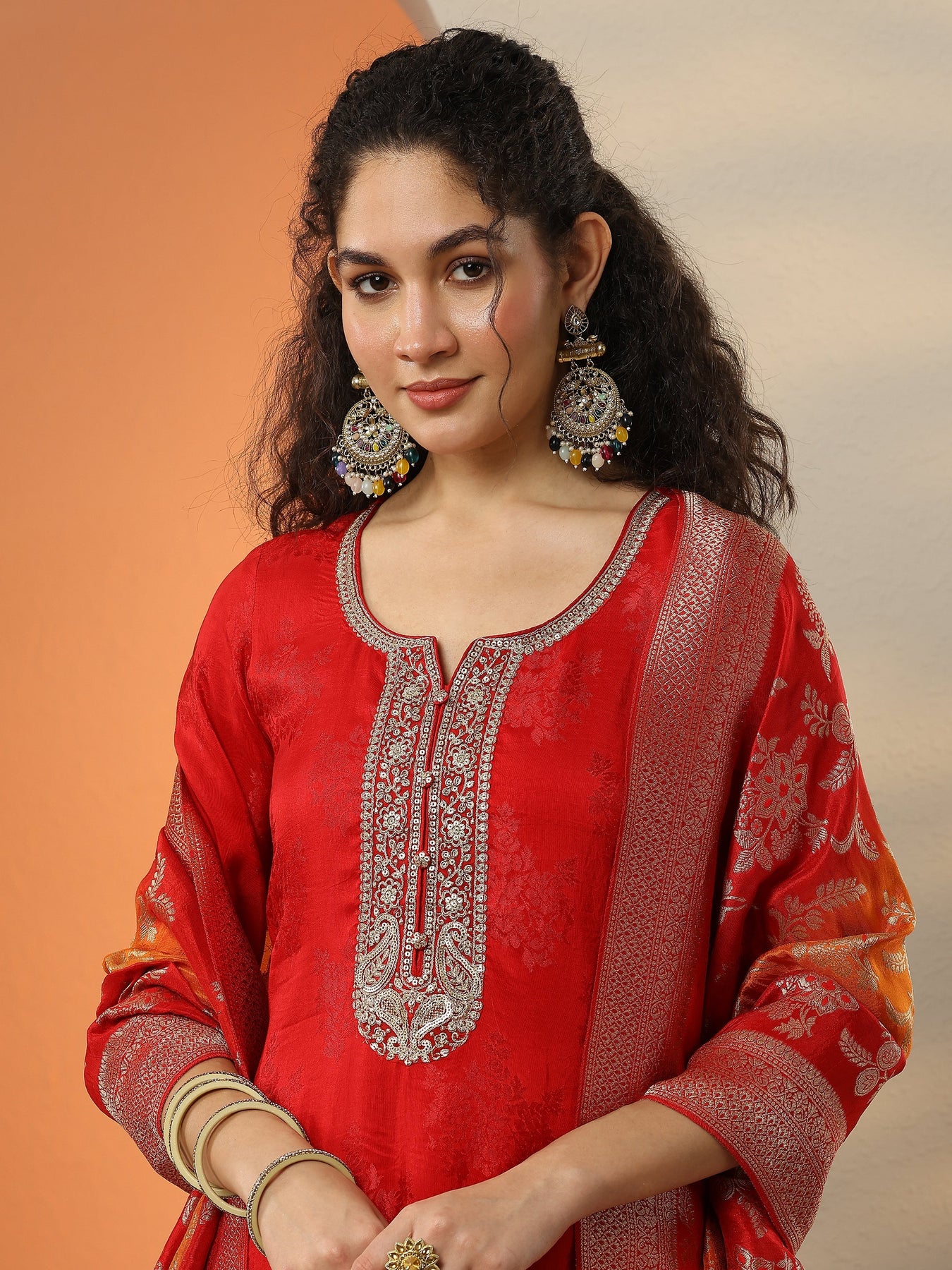 Libas Art Red Embroidered Silk Blend Straight Suit Set With Dupatta