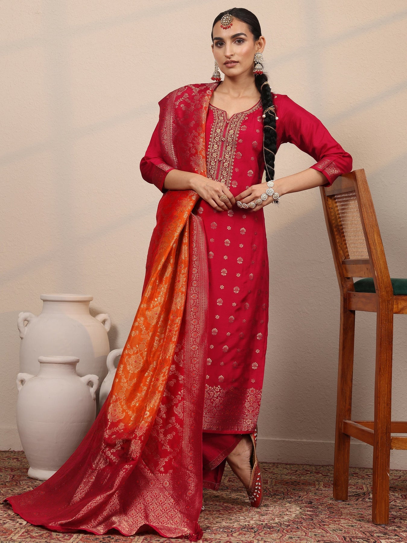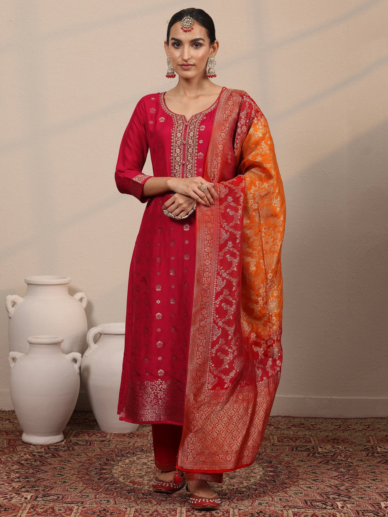 Libas Art Red Woven Design Silk Blend Straight Suit Set With Dupatta