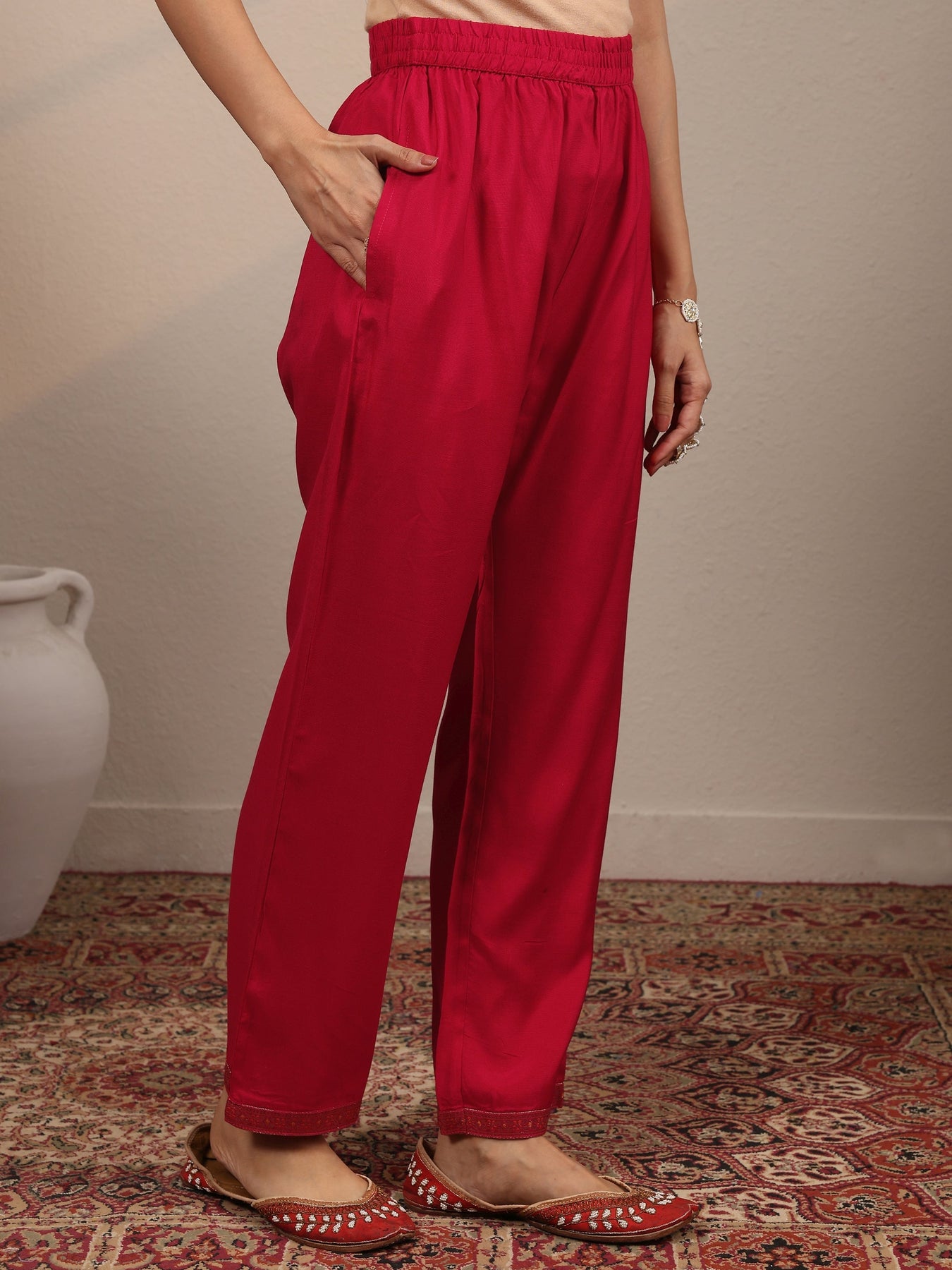 Our 3-piece Red Silk blend Straight-fit Kurta Set features a Sweetheart Neckline, Regular Sleeves, and statement yoke. Complemented with Straight Pants with a Partially Elasticated waistband and 2 pockets, and an Embroidered dupatta. Adorned with Woven Design, this style is perfect for Dark Festive.