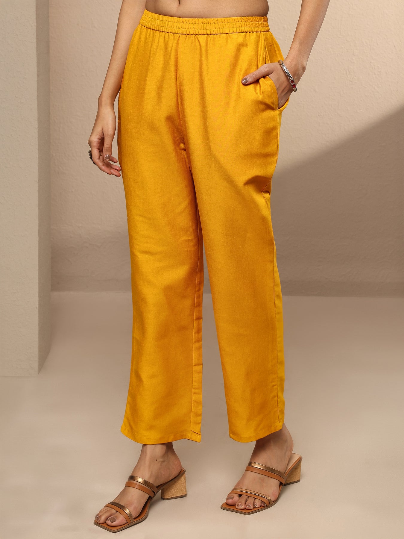 Our 3-piece yellow silk blend straight-fit kurta set features a V-neckline, regular sleeves, and statement yoke. Complemented with straight pants with a partially elasticated waistband and 2 pockets, and a printed dupatta. Adorned with ethnic motif Printed, this style is perfect for festive occasions.