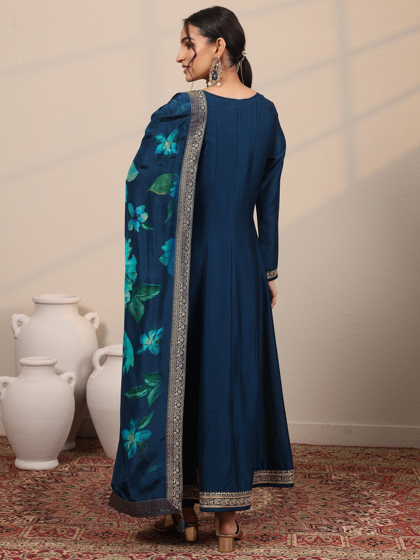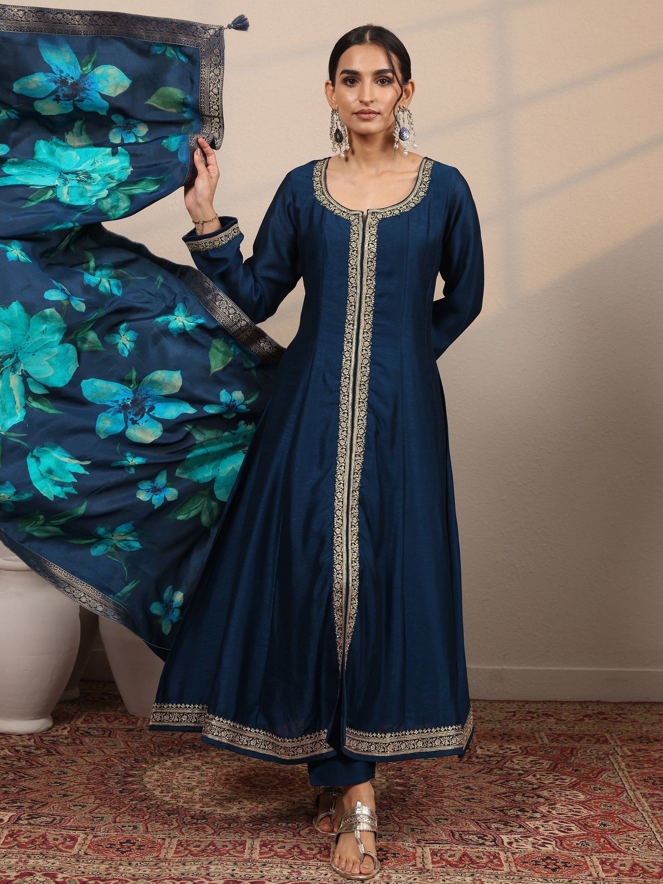 Navy Blue Embroidered Silk Blend A-Line Suit Set With Dupatta