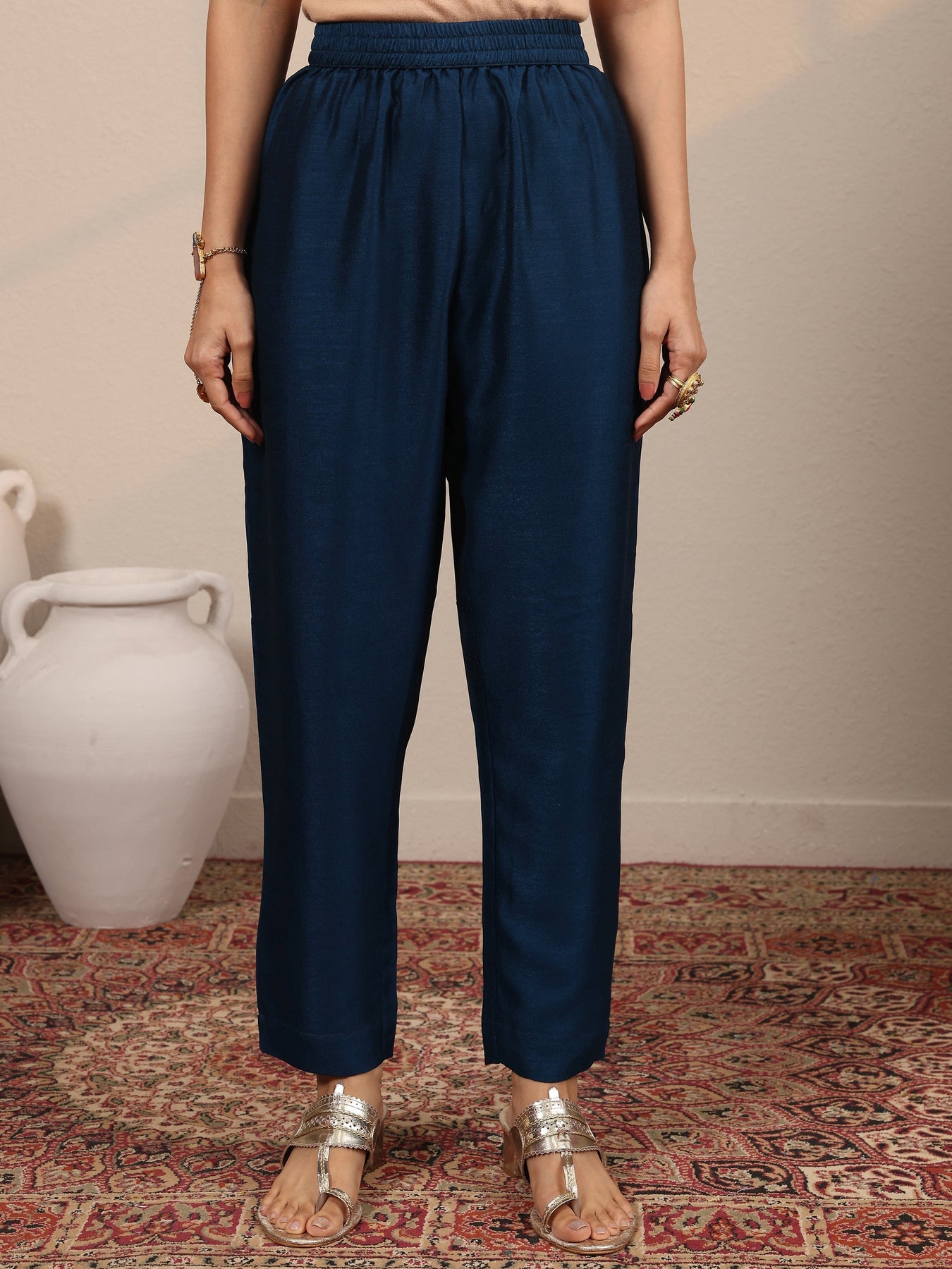 Our 3-piece Navy Blue Silk blend Straight-fit Kurta Set features a Round Neckline, Regular Sleeves, and statement yoke. Complemented with Straight Pants with a Partially Elasticated waistband and 2 pockets, and a Printed dupatta. Adorned with Embroidered, this style is perfect for Dark Festive occasions.
