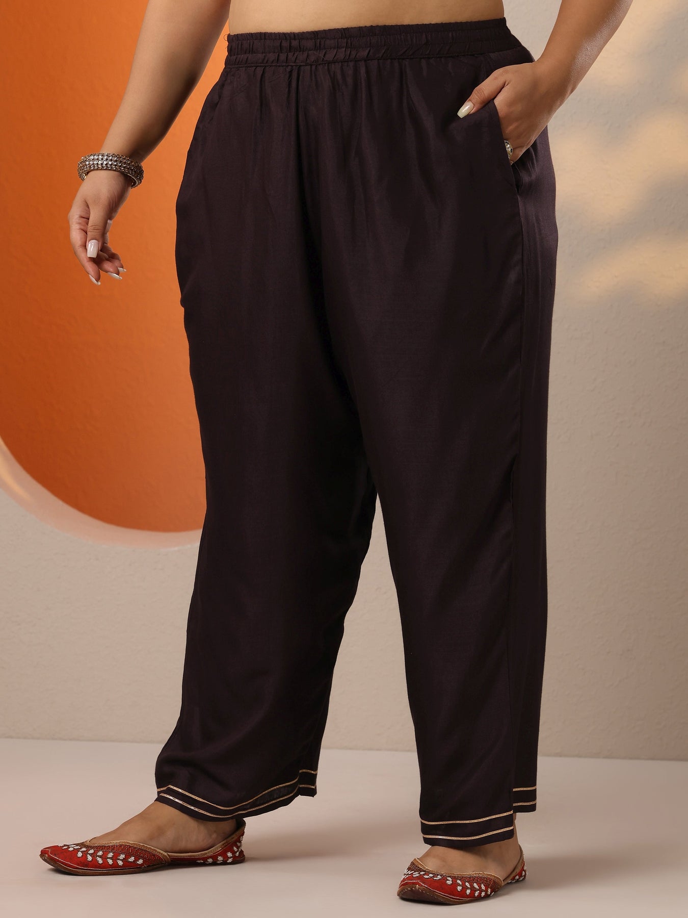 Our 3-piece maroon and black muslin straight-fit kurta set features a round neckline, regular sleeves, and a statement yoke. Complemented with lining and straight pants with a partially elasticated waistband and 2 pockets, and a printed dupatta. Adorned with floral embellishments, this style is perfect for dark festive occasions.