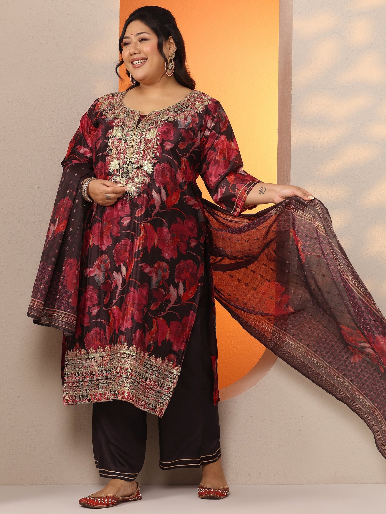 Plus Size Brown Printed Chinon Straight Suit Set With Dupatta