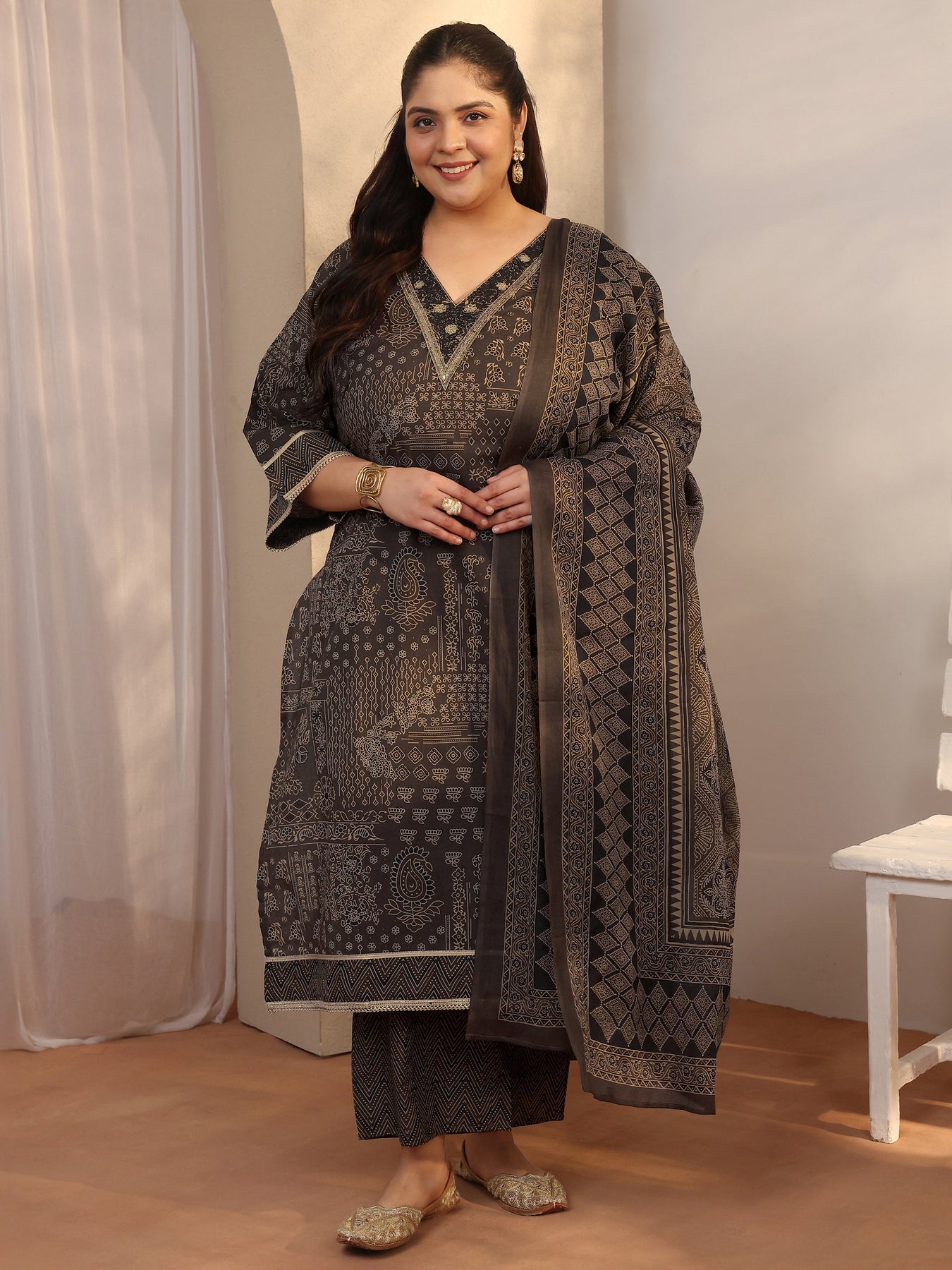Plus Size Brown Printed Cotton Straight Suit Set With Dupatta