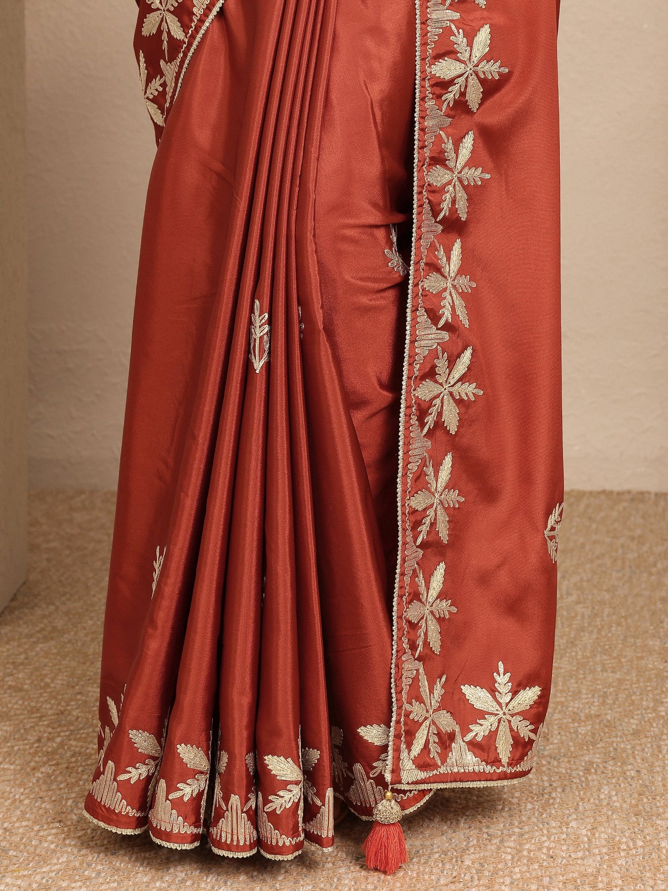 Our rust printed silk blend saree features captivating floral embroidery. Complemented with a stitched blouse. This charming saree is perfect for festive occasions.