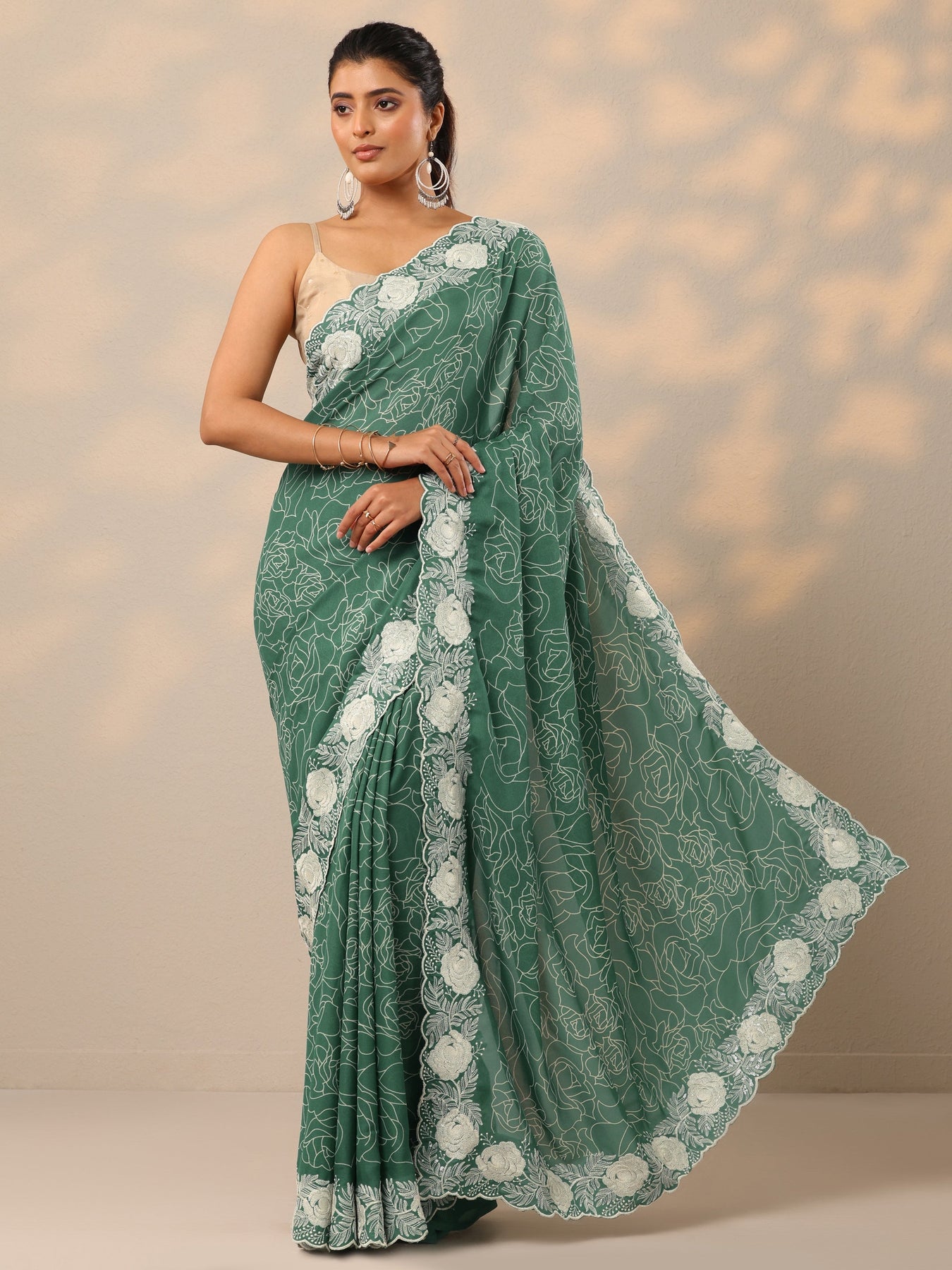 Turquoise blue Printed Georgette Sarees With Unstitched Blouse Piece
