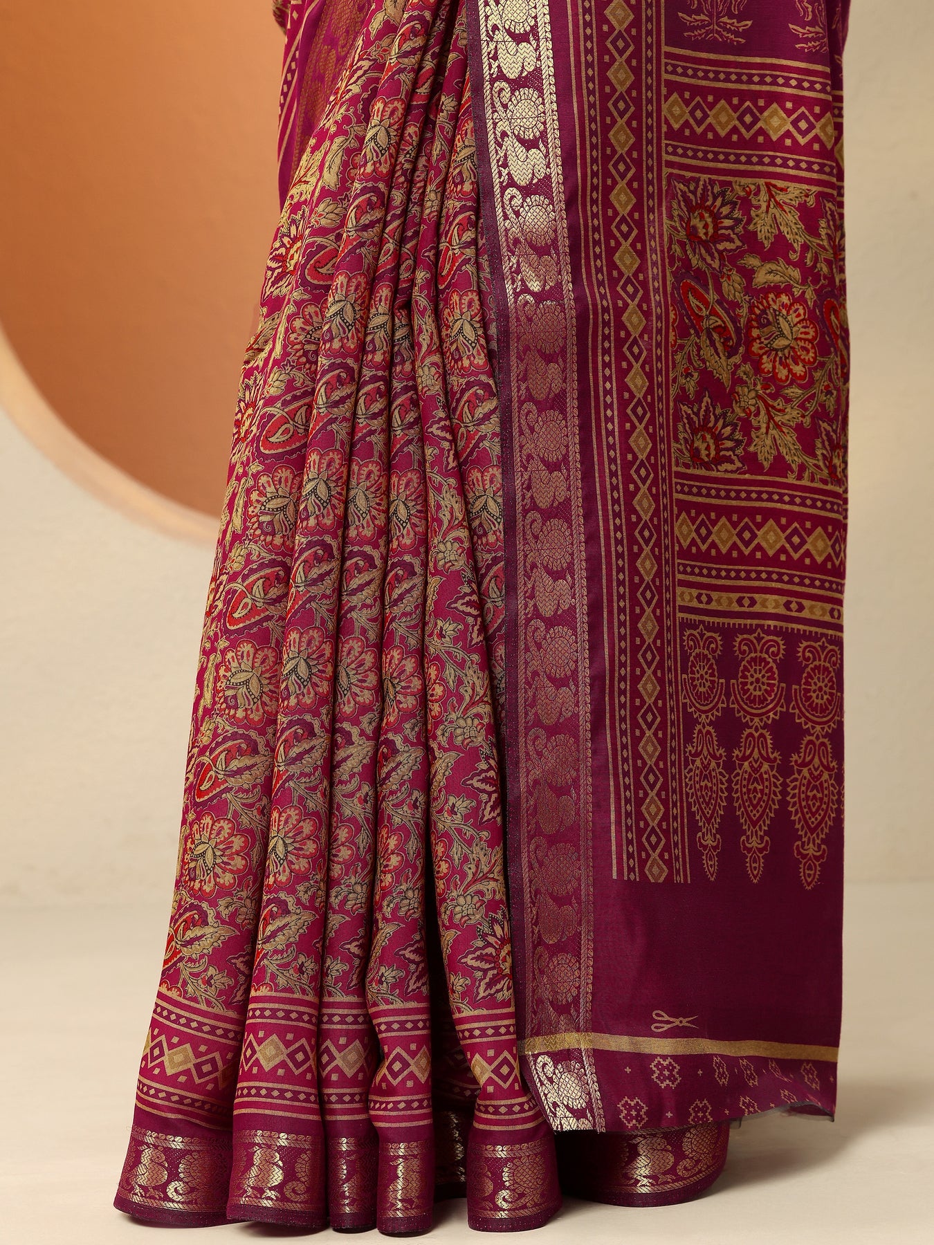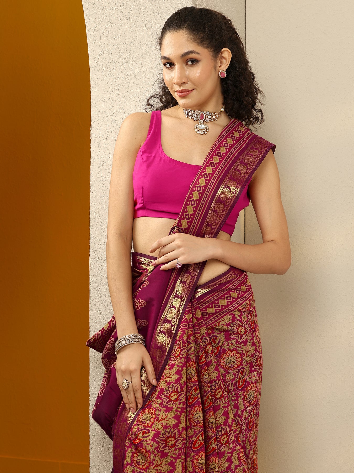 Pink Printed Silk Blend Saree With Unstitched Blouse Piece