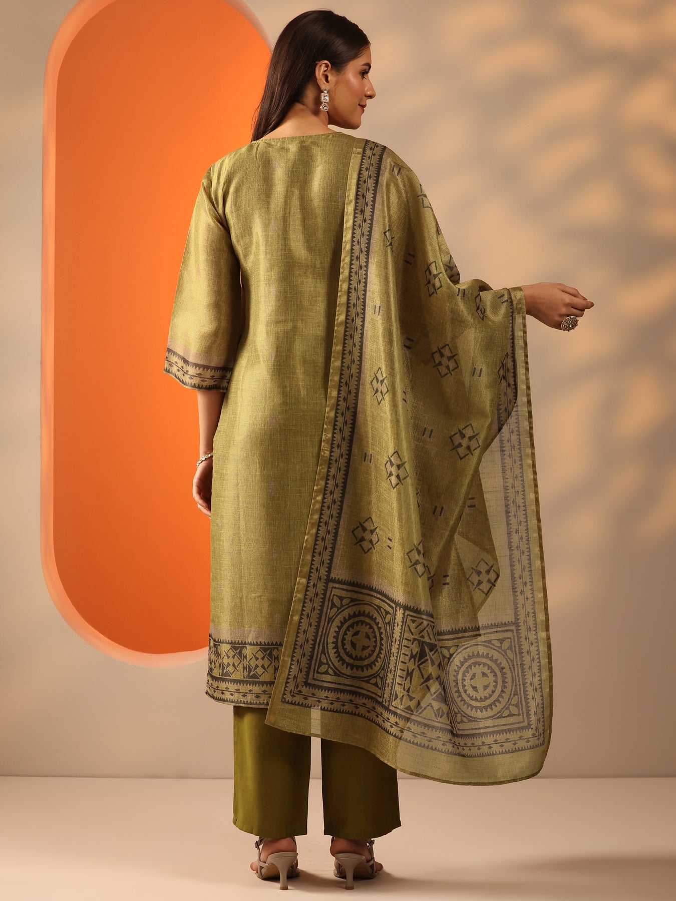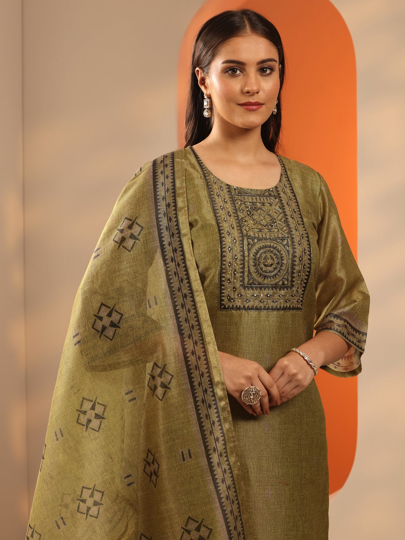 Olive Yoke Design Silk Blend Straight Suit Set With Dupatta
