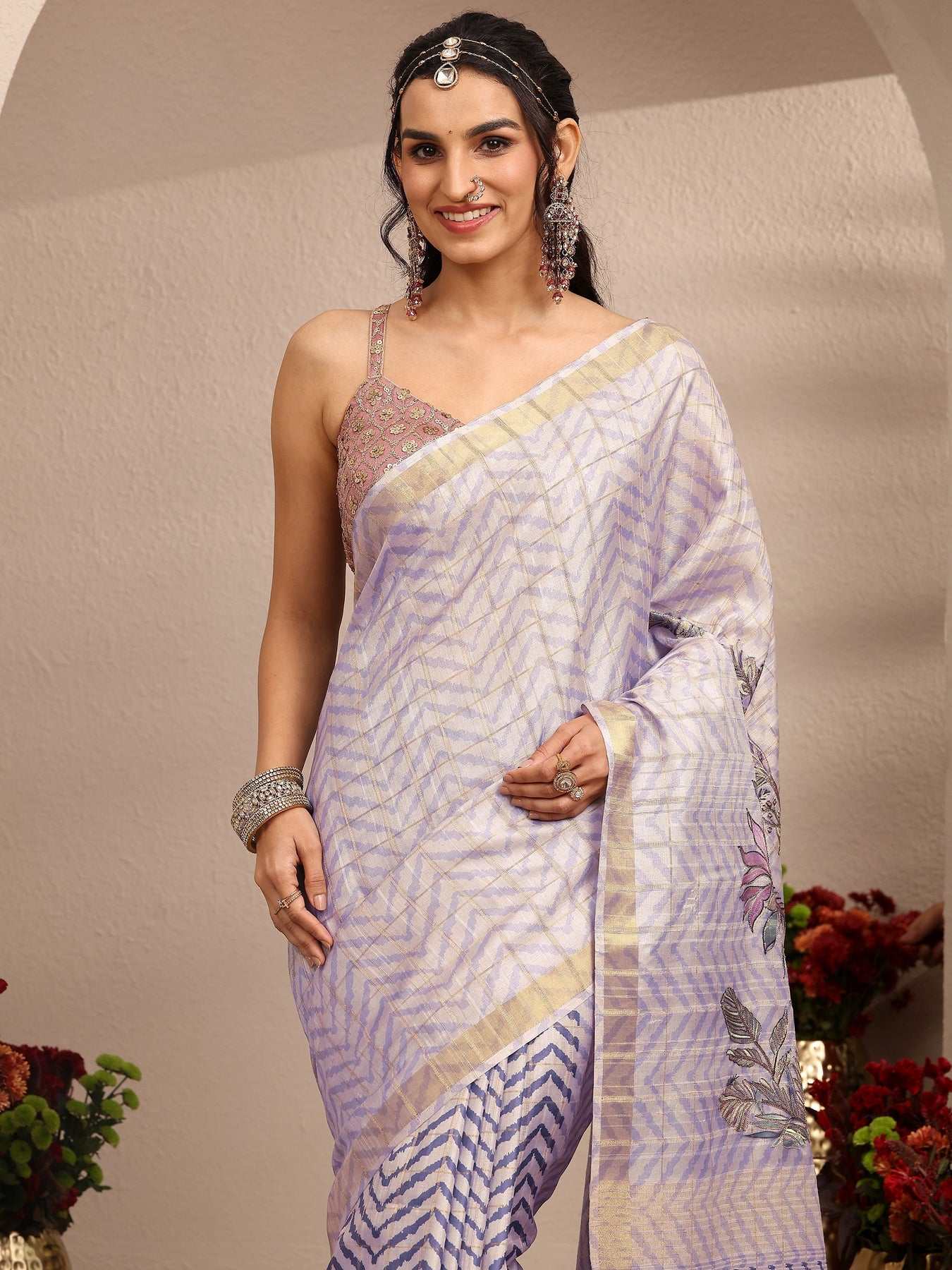 Lavender Embroidered Silk Blend Saree With Unstitched Blouse Piece