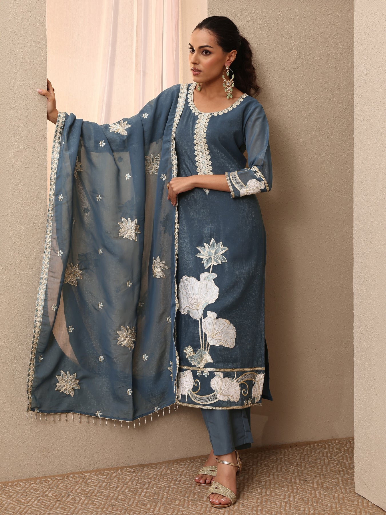 Our 3-piece blue Chinon kurta set features a straight-fit design with a round neckline, regular sleeves, and statement yoke. Complemented with lining and straight pants with a partially elasticated waistband and 2 pockets, and an embroidered dupatta. Adorned with floral embroidered, this style is perfect for dark festive occasions.