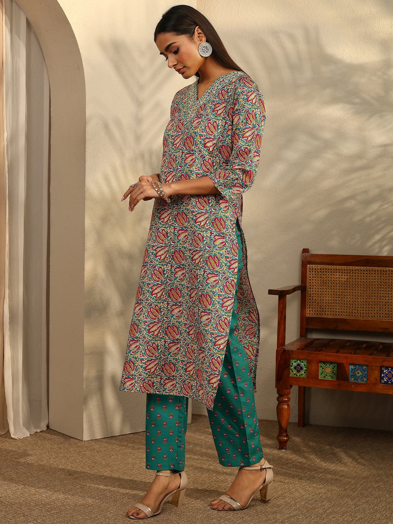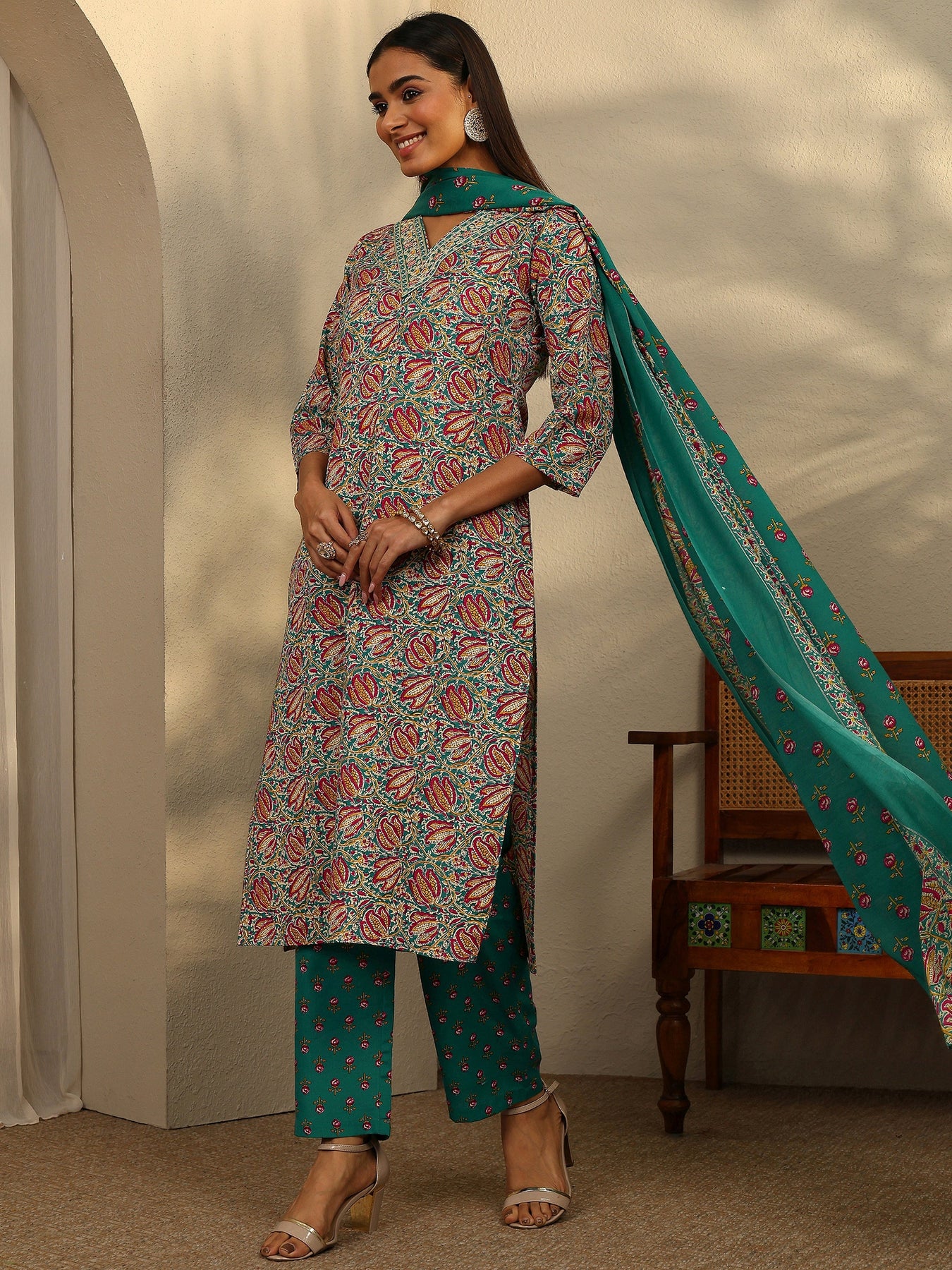 Our 3-piece multi and teal cotton blend straight-fit kurta set features a V-neckline, regular sleeves, and statement yoke. Complemented with straight pants with a partially elasticated waistband and 2 pockets, and a printed dupatta. Adorned with floral printed, this style is perfect for festive occasions.
