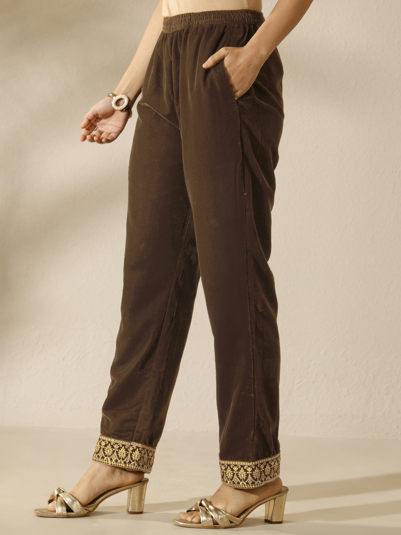 Our 3-piece brown velvet kurta set features a straight-fit design with a round neckline, regular sleeves, and statement yoke. Complemented with straight pants with a partially elasticated waistband and 2 pockets, and an embroidered dupatta. Adorned with ethnic motif woven design, this style is perfect for dark festive occasions.