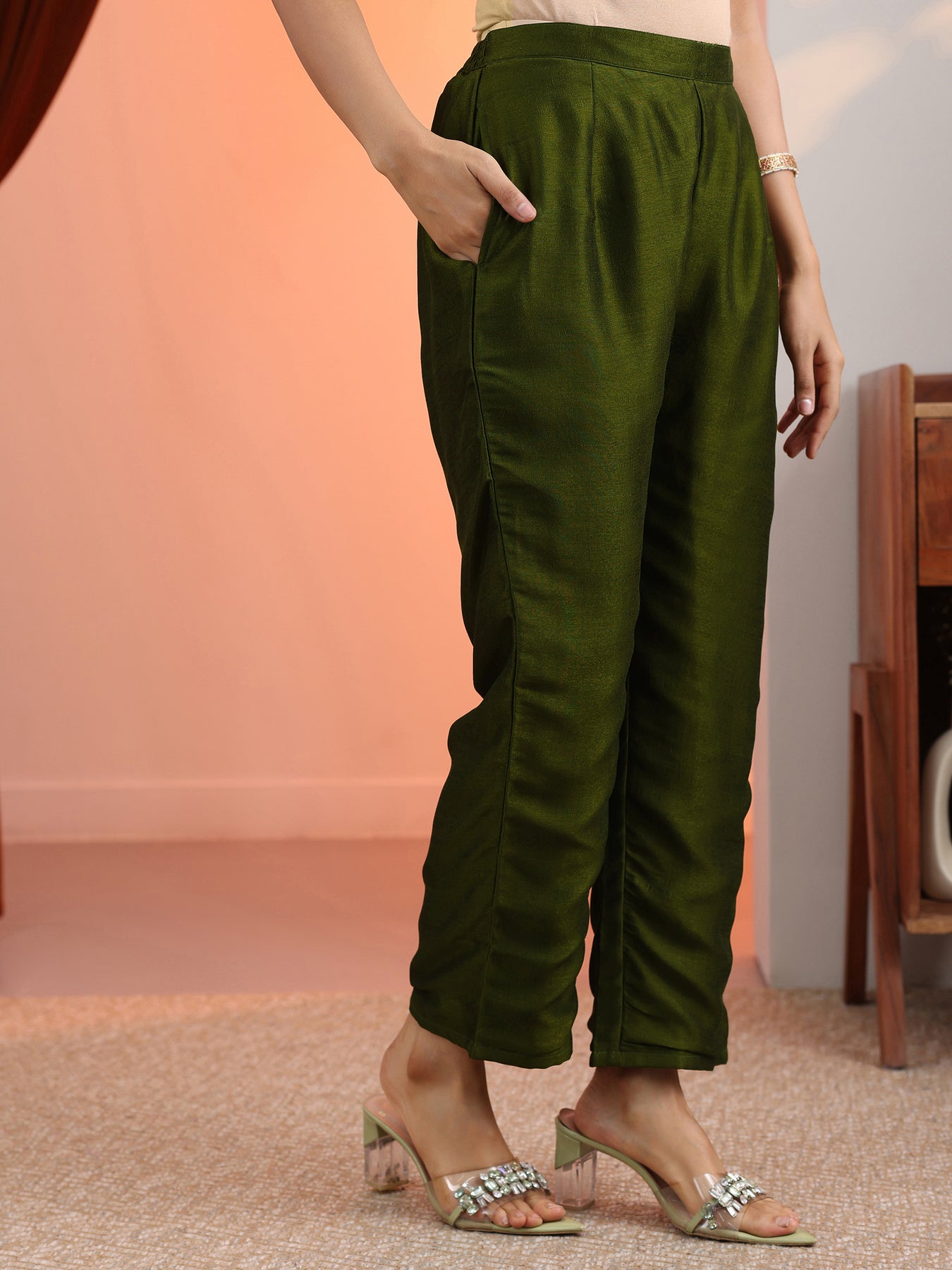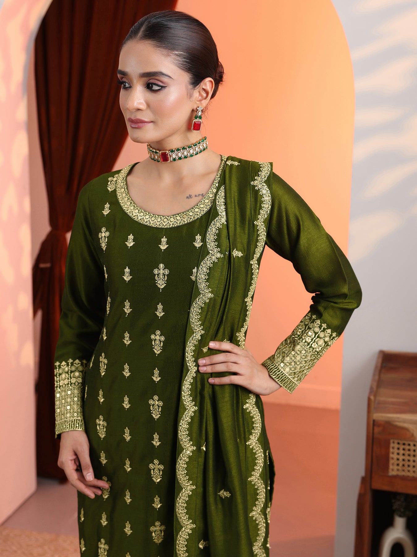 Olive Embroidered Chinon Straight Suit Set With Dupatta