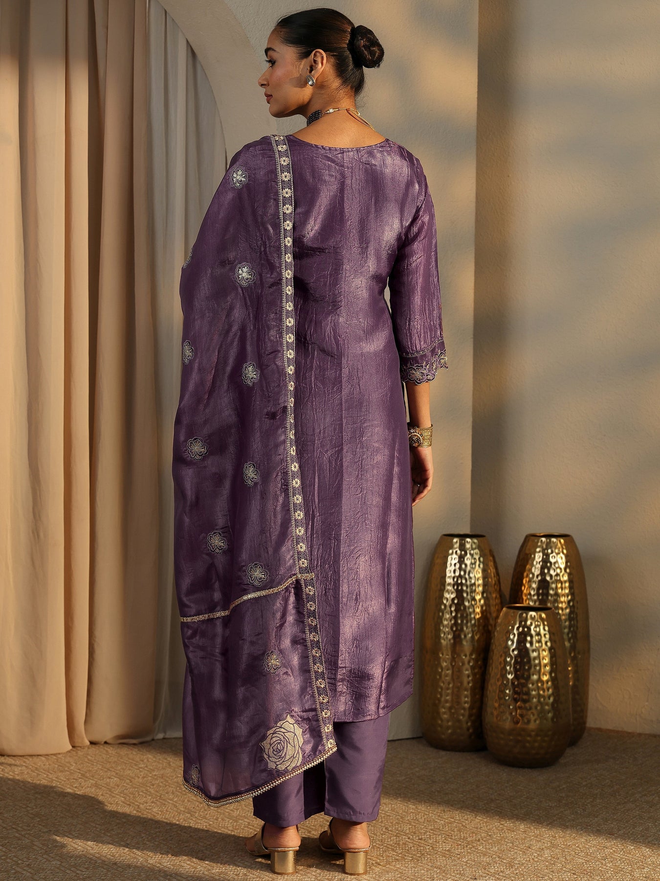 Purple Embroidered Organza Straight Suit Set With Dupatta
