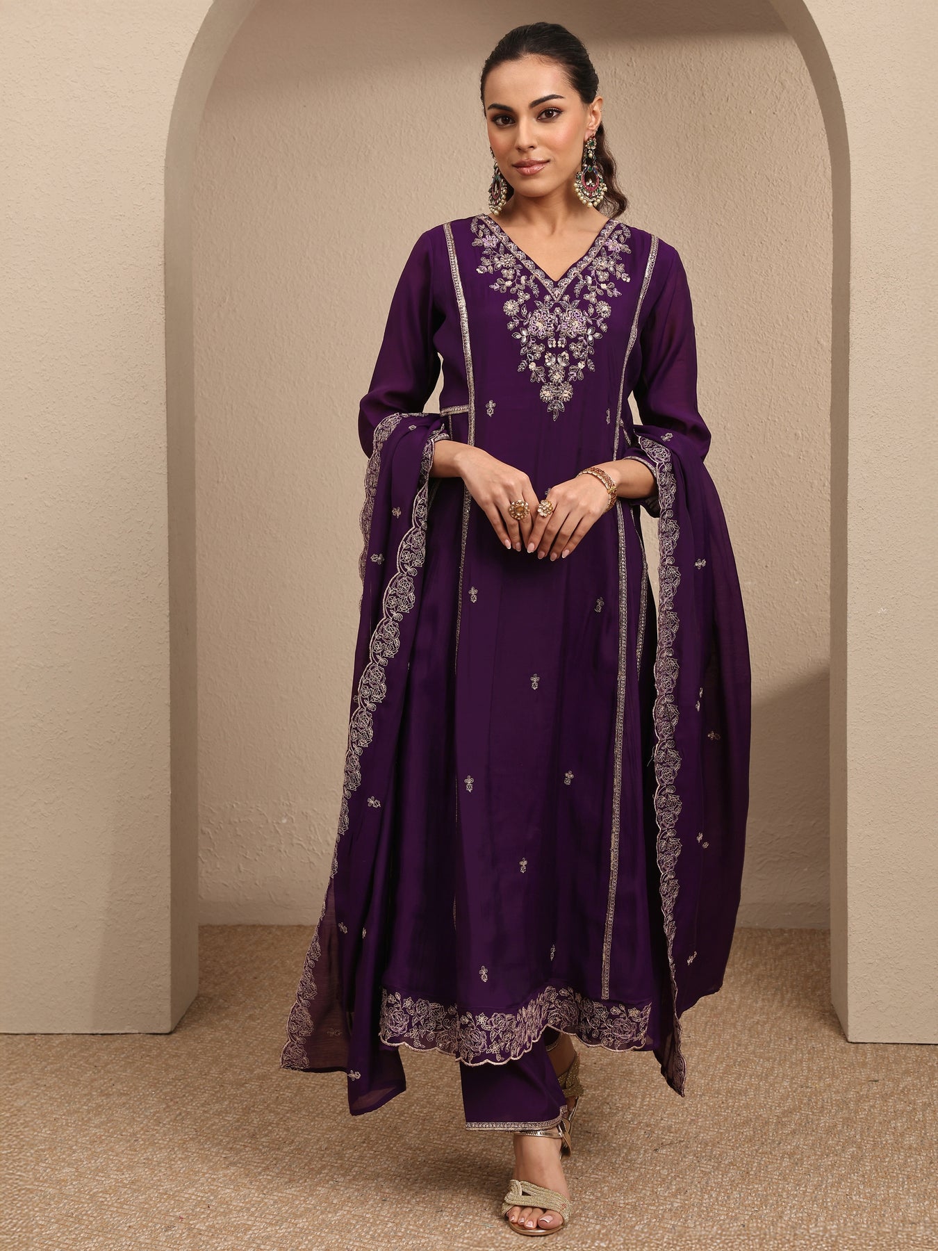 Purple Embroidered Silk Blend A-line Suit Set With Dupatta