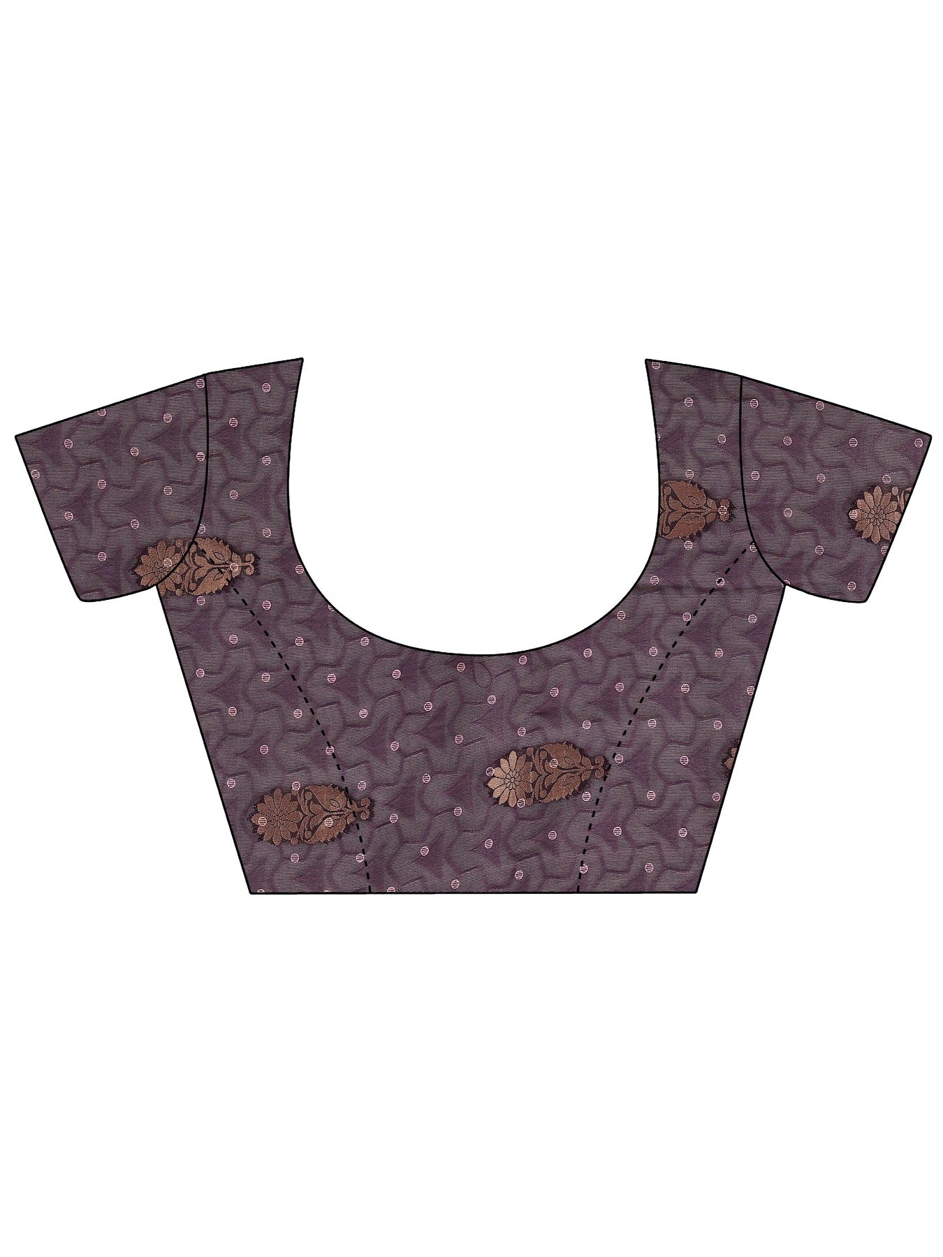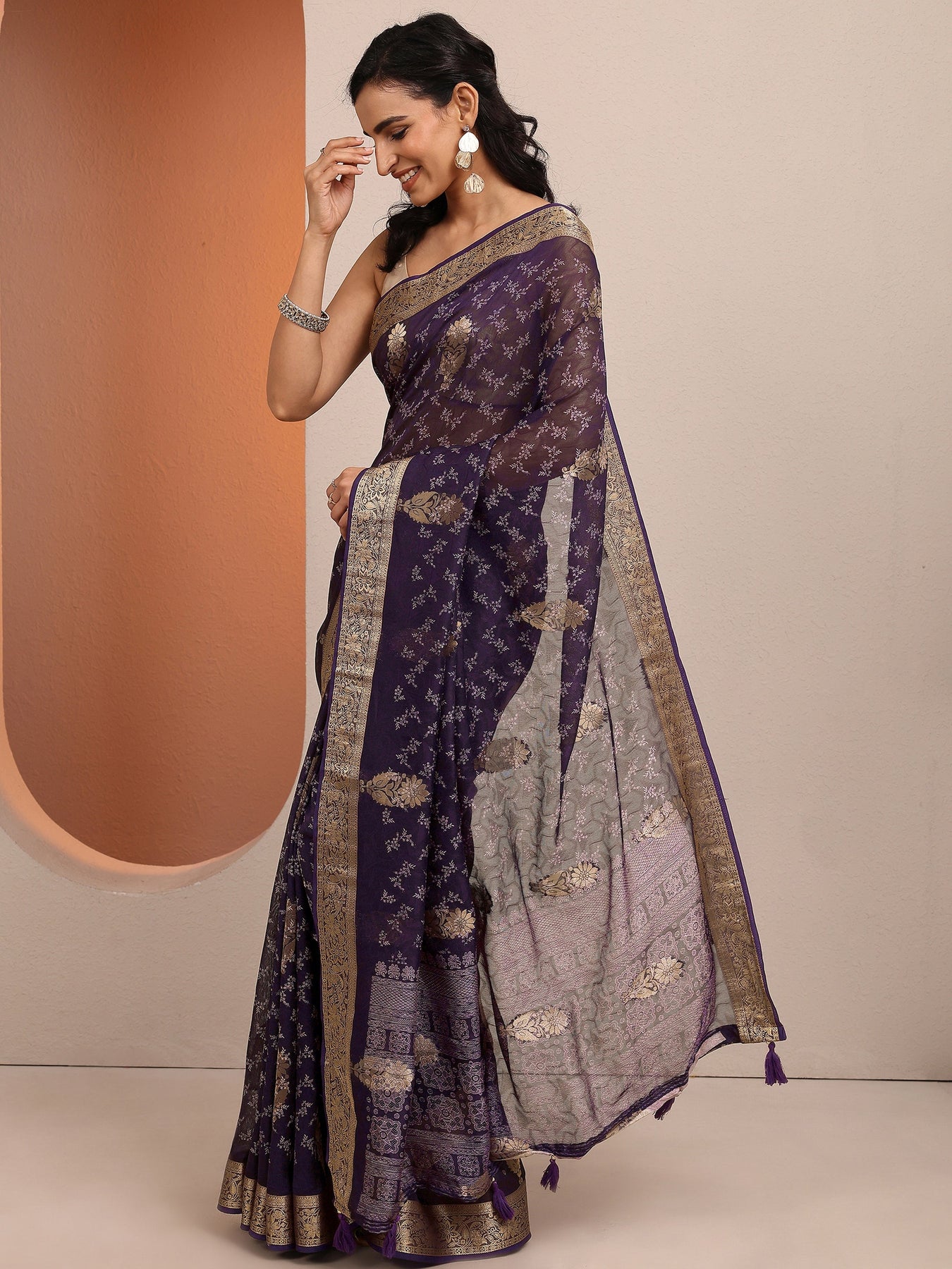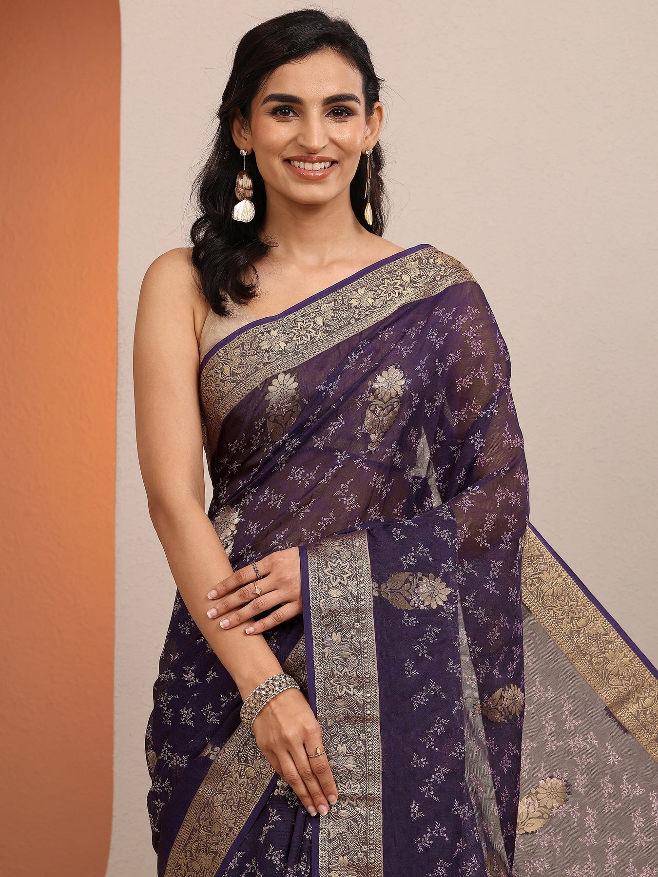 Purple Printed Silk Blend Saree With Unstitched Blouse Piece