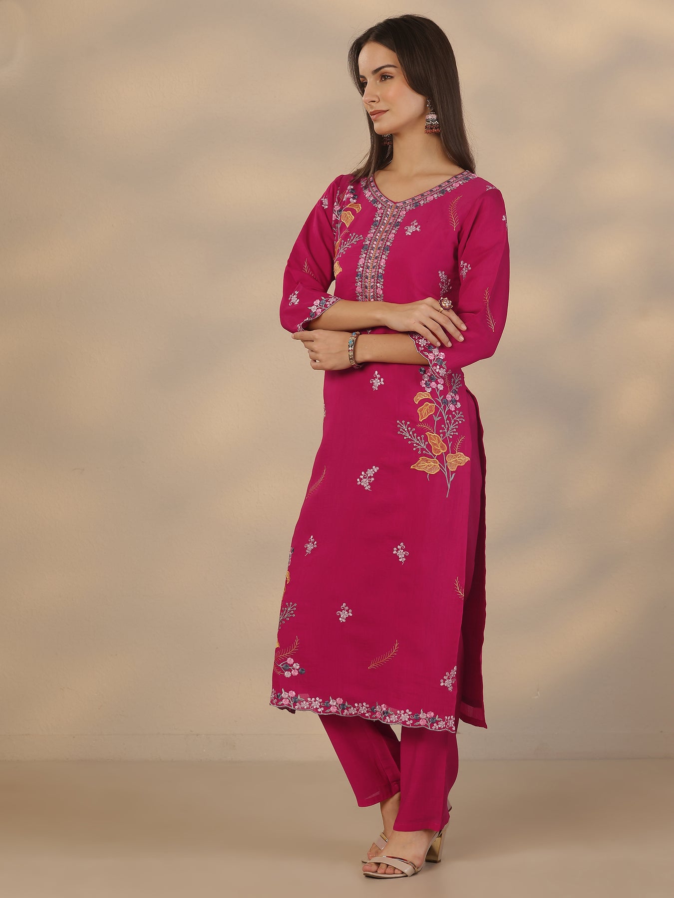 Pink Embroidered Chanderi Cotton Straight Suit Set With Dupatta