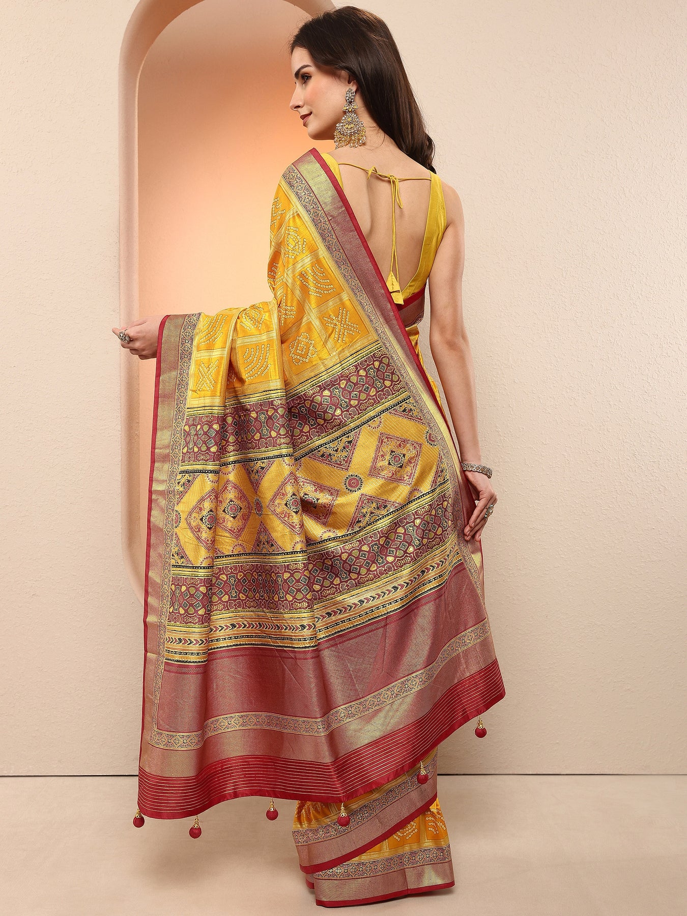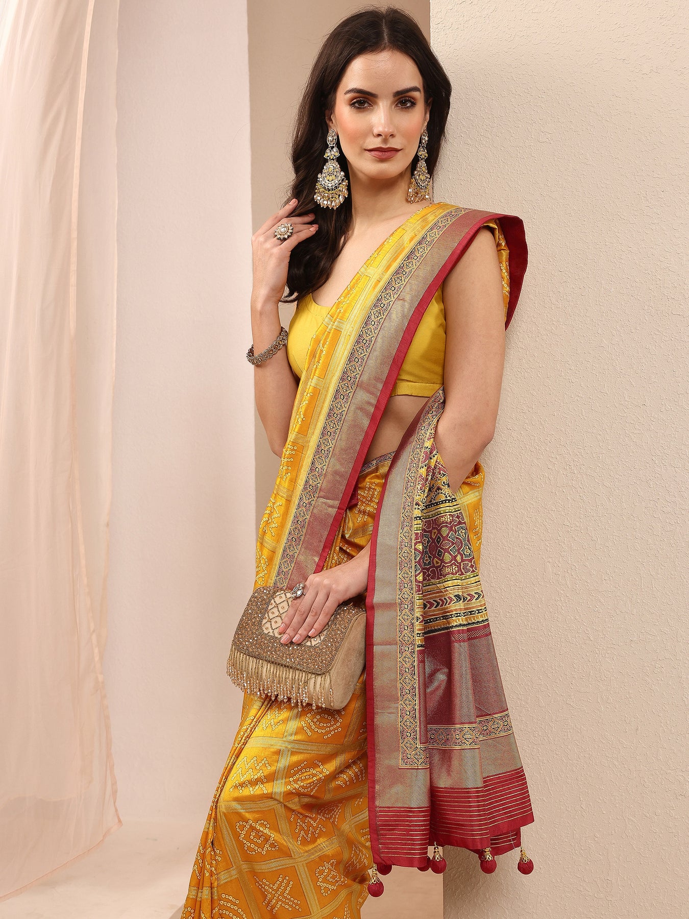 Mustard Bandhani Printed Sarees With Unstitched Blouse Piece