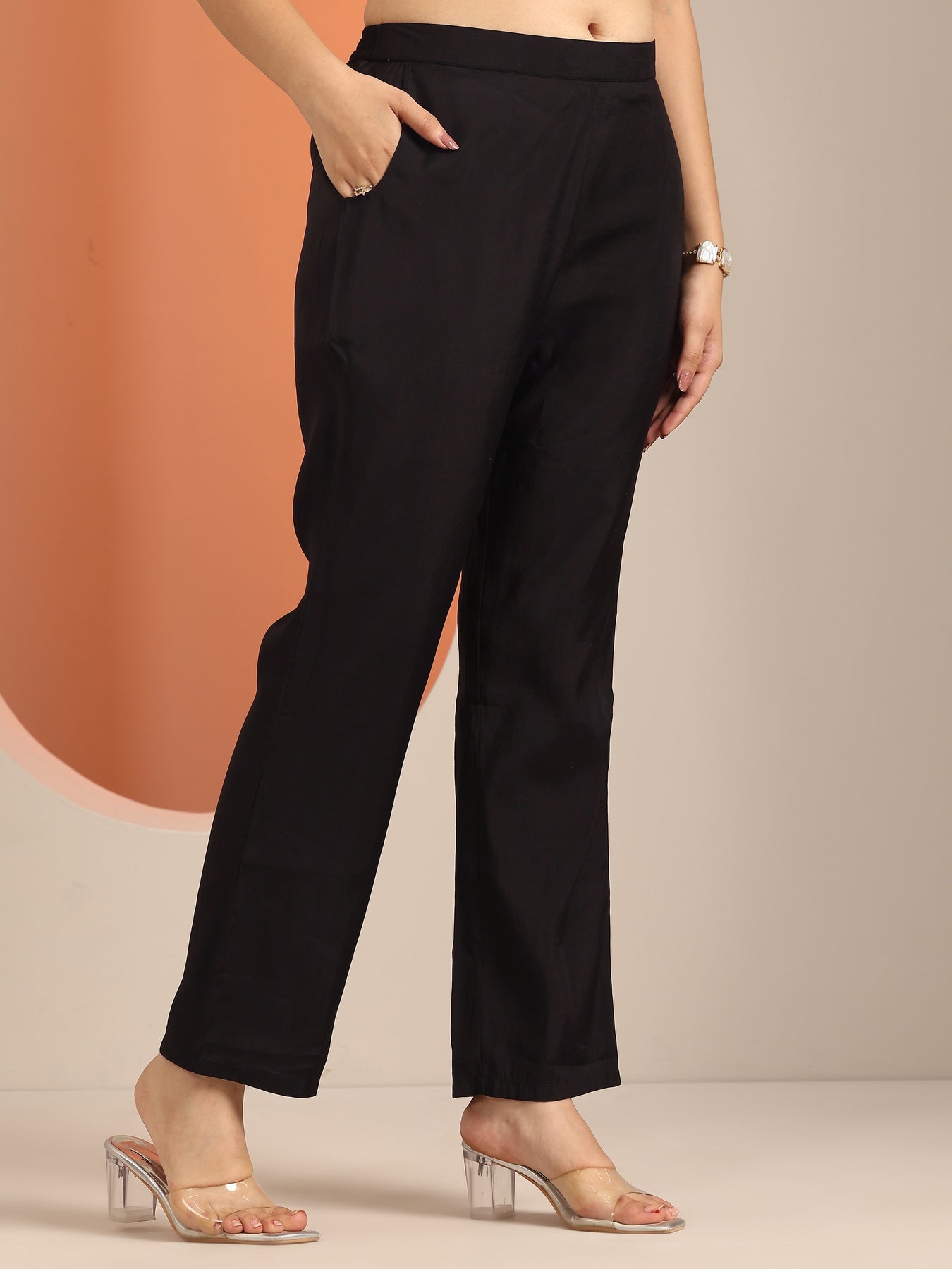 Our 3-piece black printed cotton blend Anarkali suit set features a flared kurta with a keyhole neckline and comfortable full sleeves. Complemented with trousers with a fully elasticated waistband and a dupatta. Highlighted with floral prints, this style is ideal for casual outings.