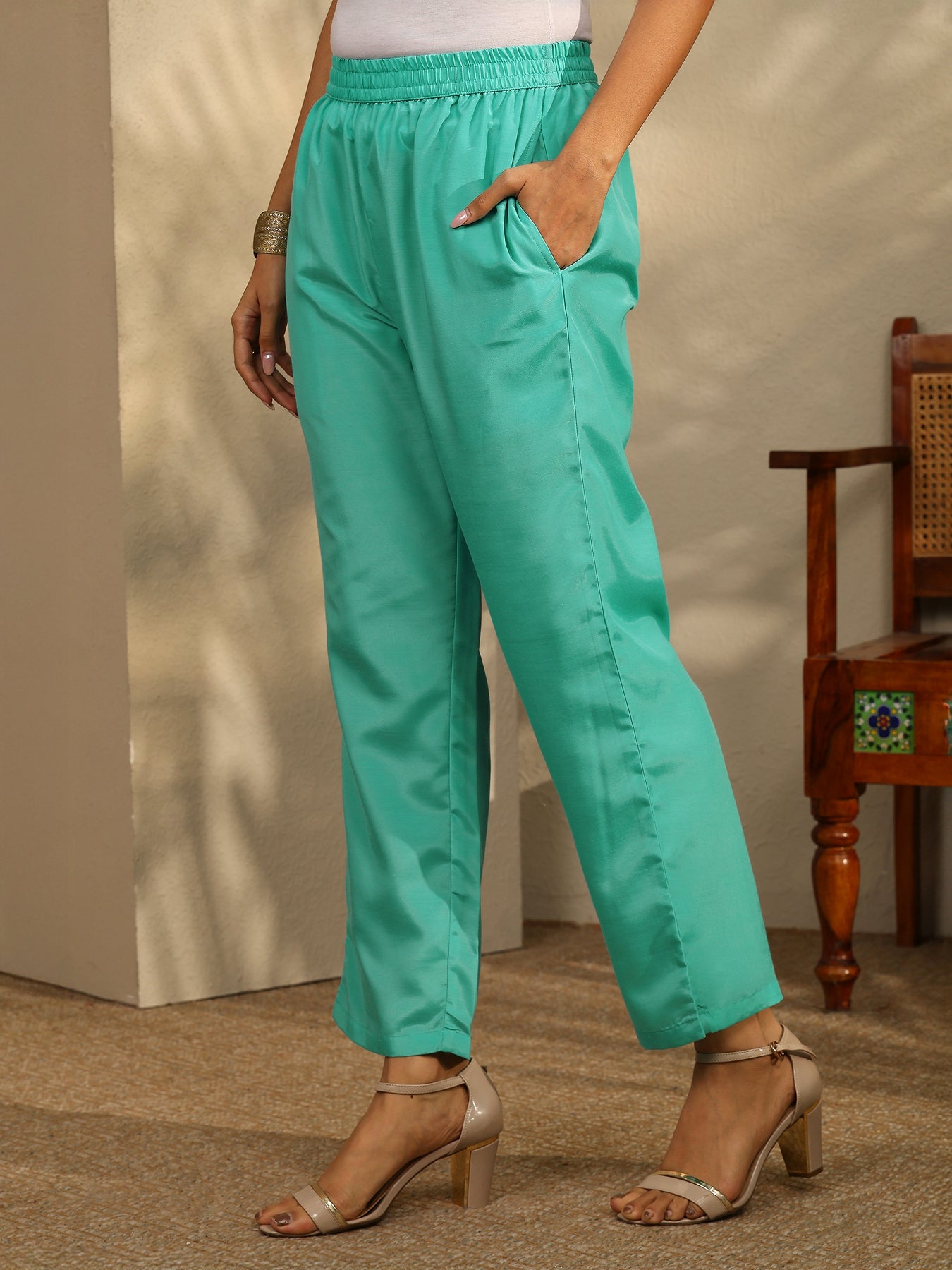 Our 3-piece sea green Chinon straight-fit kurta set features a round neckline, regular sleeves, and a statement yoke. Complemented with lining and straight pants with a partially elasticated waistband and 2 pockets, and an embroidered dupatta. Adorned with bandhani printed, this style is perfect for festive occasions.