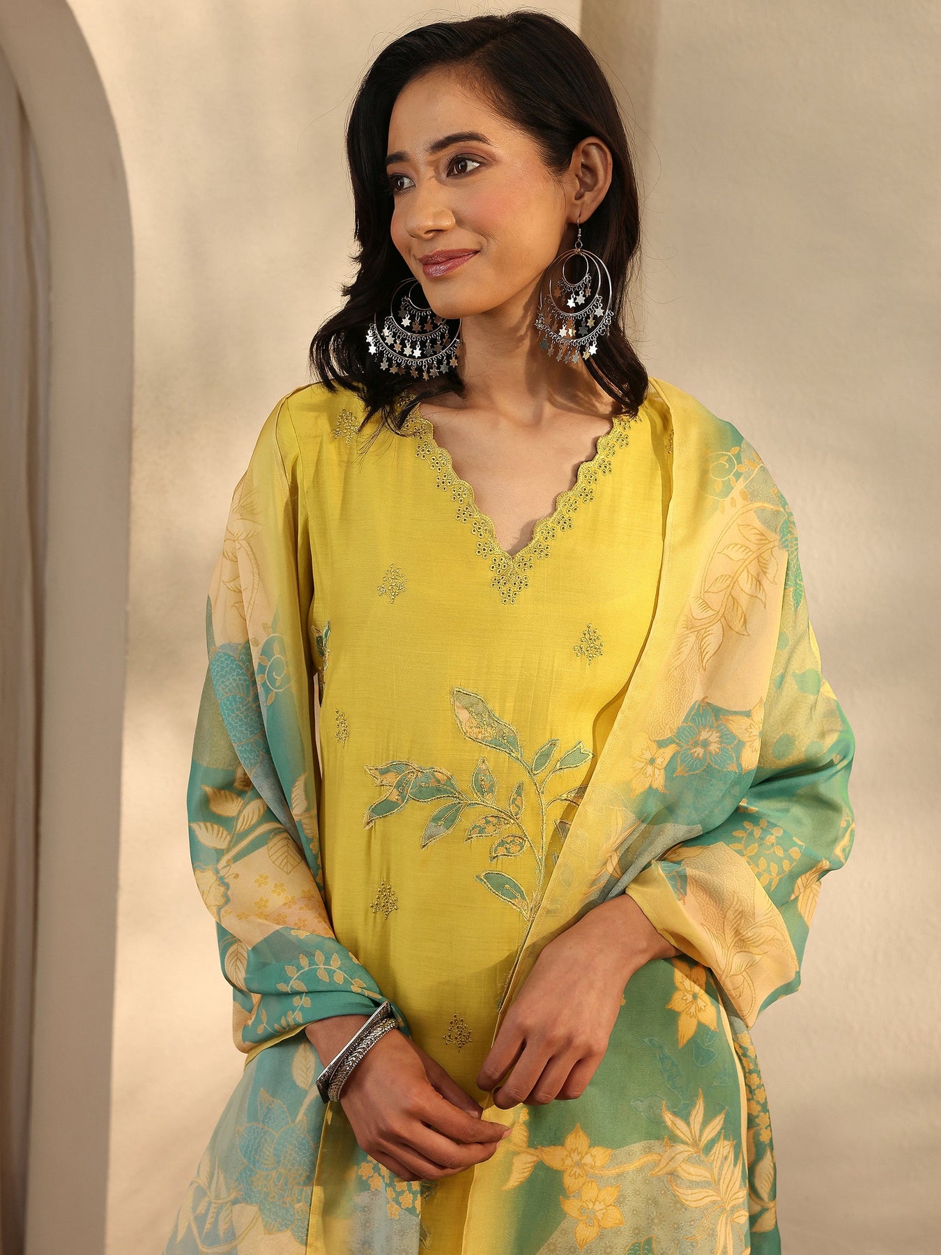 Our 3-piece yellow Chanderi cotton straight-fit kurta set features a V-neckline, regular sleeves, and statement yoke. Complemented with lining and straight pants with a partially elasticated waistband and 2 pockets, and a printed dupatta. Adorned with floral embroidered, this style is perfect for festive occasions.