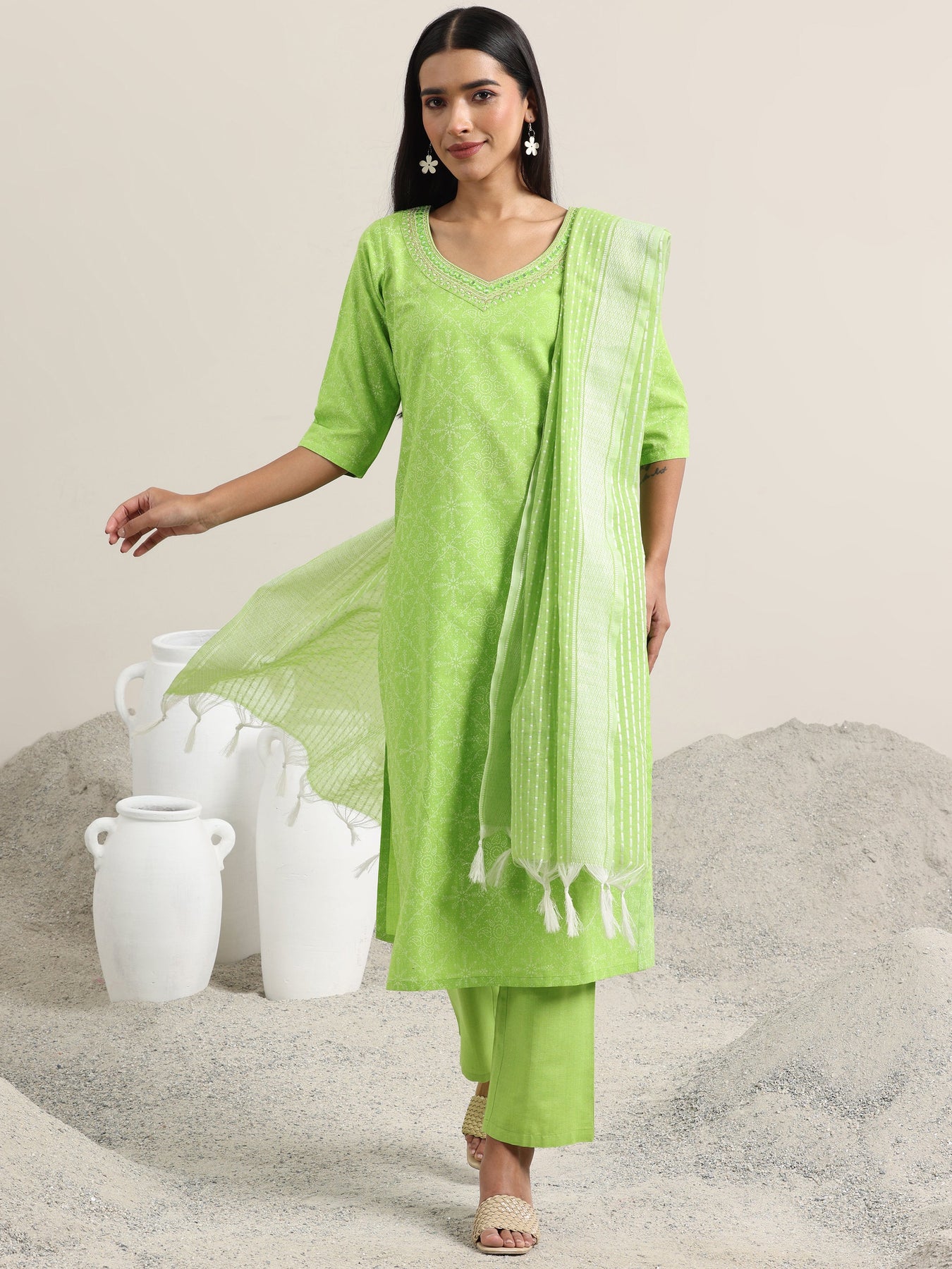 Our 3-piece green printed cotton blend straight suit set features a straight-fit kurta with a classic V-neckline and three-quarter sleeves. Complemented with solid trousers with a partially elasticated waistband, roomy pockets and a printed dupatta. Adorned with floral and bandhani-inspired prints, and mirror-work detailing, this charming style is ideal for casual outings.