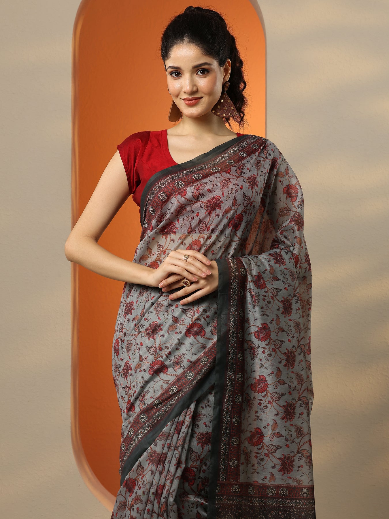 Green Printed Silk Blend Saree With Unstitched Blouse Piece