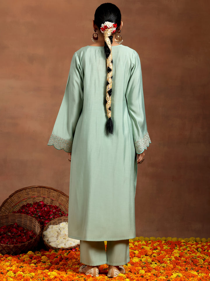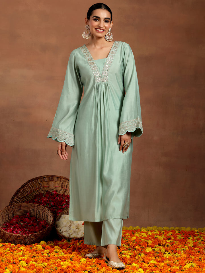 Our 2-piece Sea Green Silk Blend features a Straight-fit Kurta with a Square Neckline, Bell Sleeves, and statement Yoke. Complemented with Straight Pants with an Elasticated waistband. Adorned with Embroidered accents, this style is perfect for casual occasions.