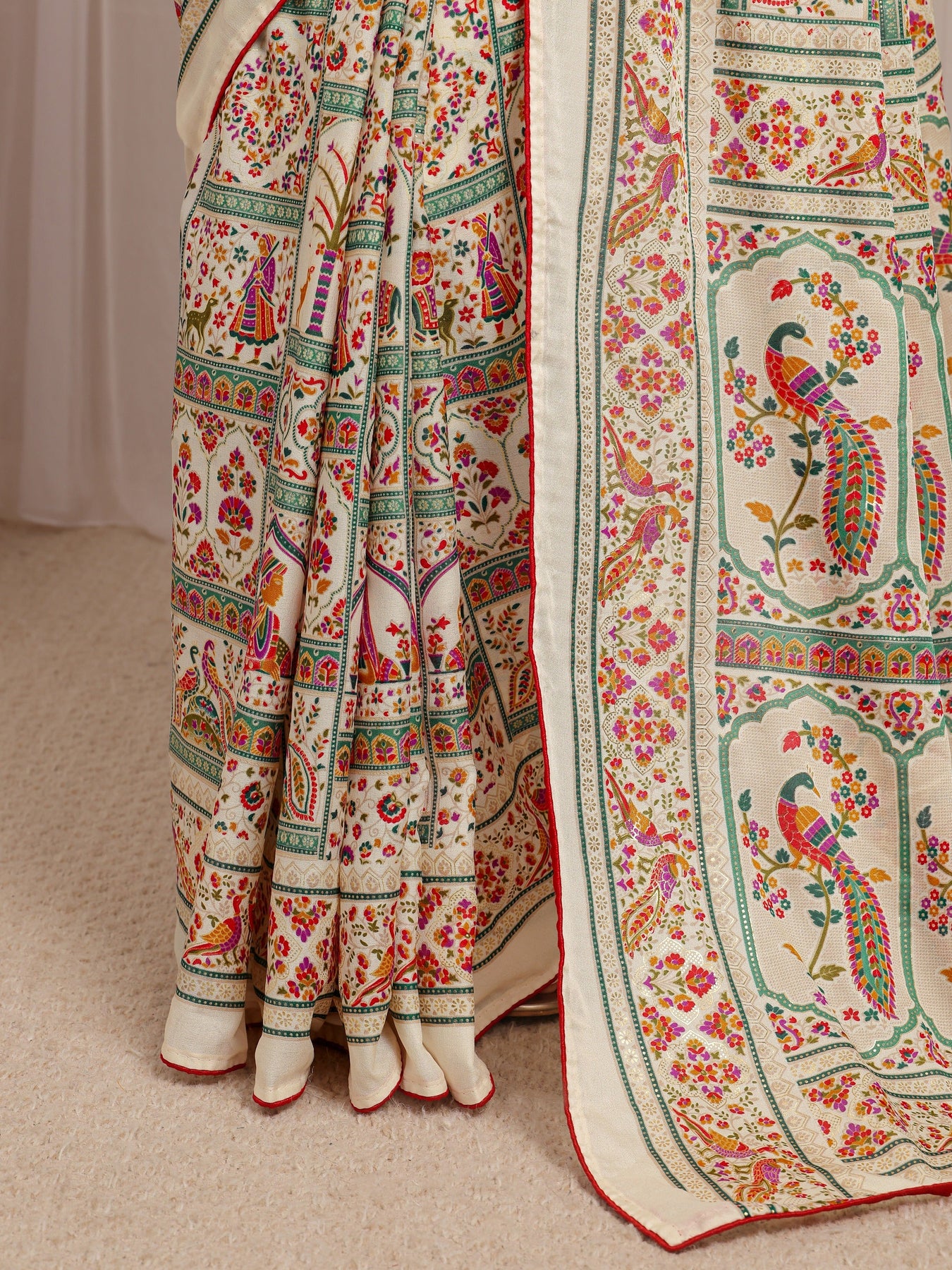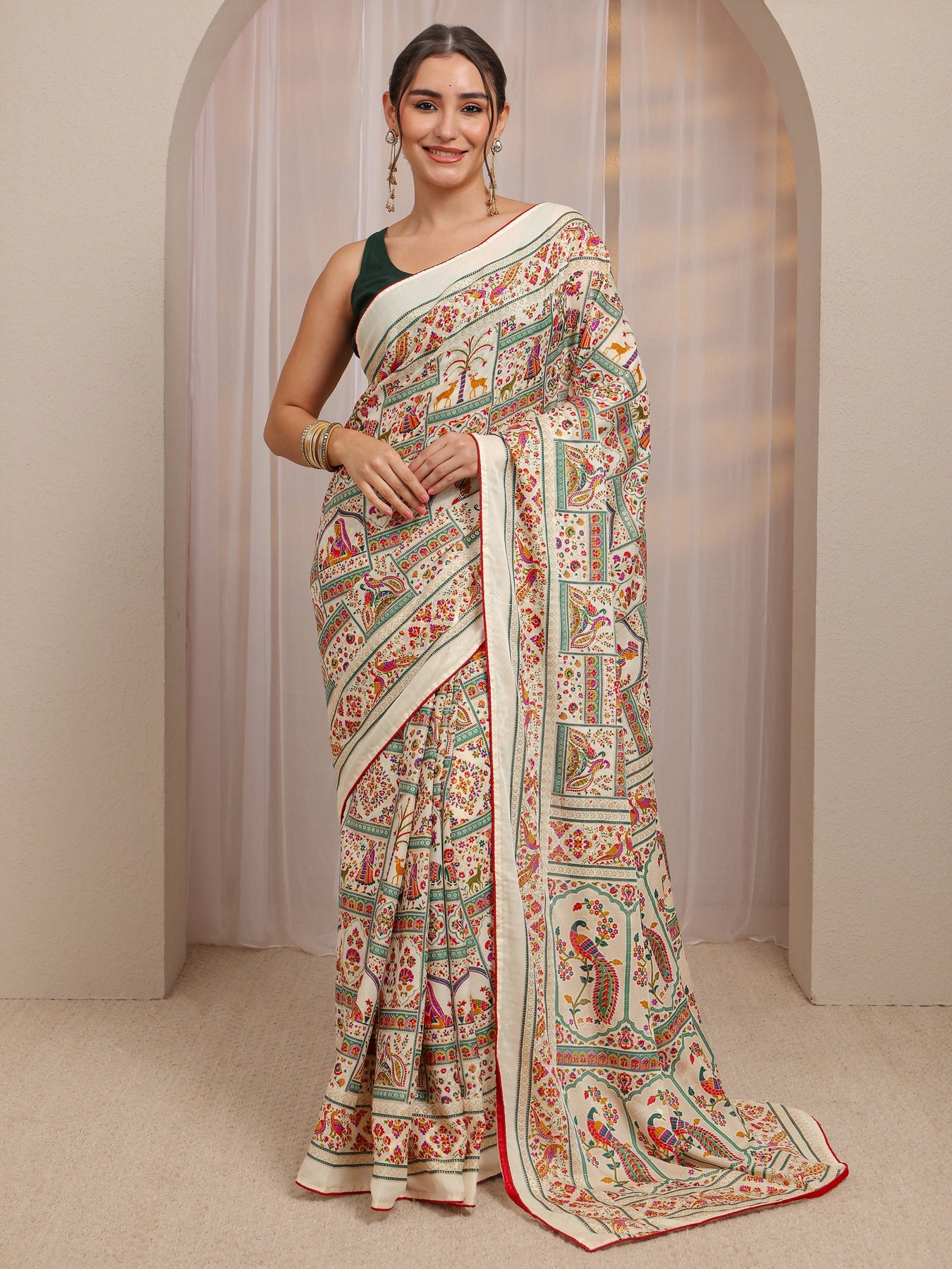 Ivory Ethnic Motifs Printed Silk Blend Saree