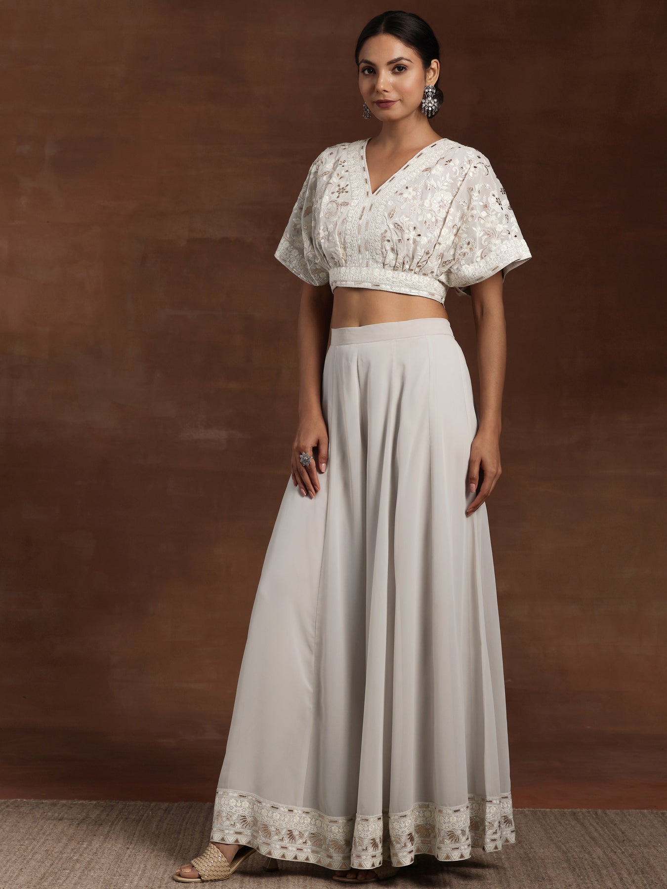 Our 3-piece grey embroidered poly georgette co-ord set features an embellished V-neck crop top with short sleeves and pleated detailing. Complemented with flared palazzos with a partially elasticated waistband and a dupatta. Adorned with intricate thread work and sequins, this charming style is perfect for light festivities.