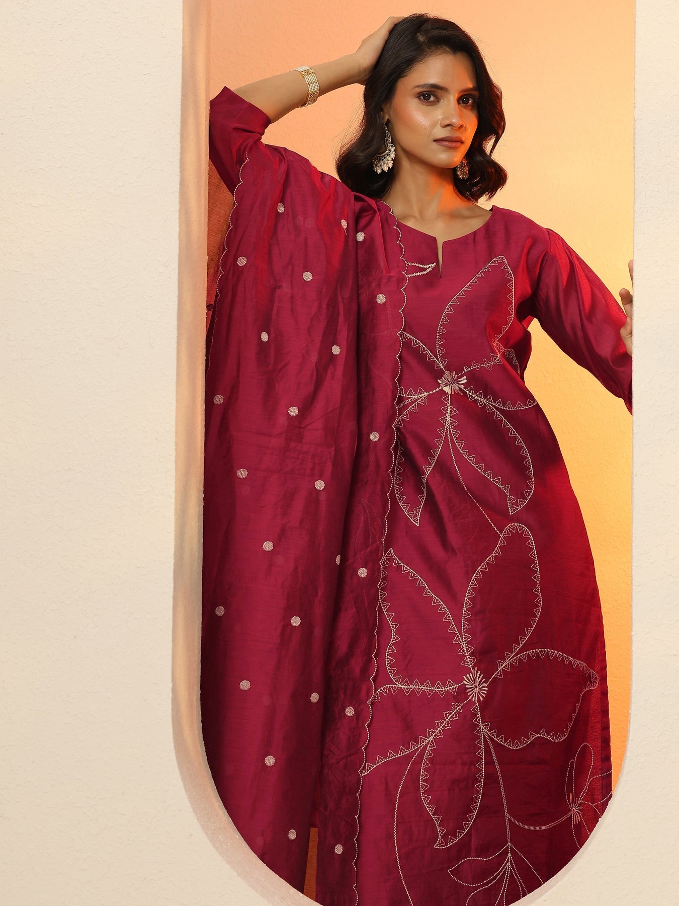 Maroon Embroidered Silk Blend  Straight Suit Set With Dupatta