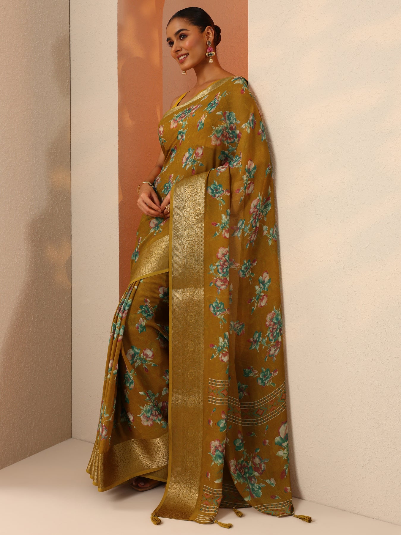 Mustard Printed Georgette Saree With Unstitched Blouse Piece