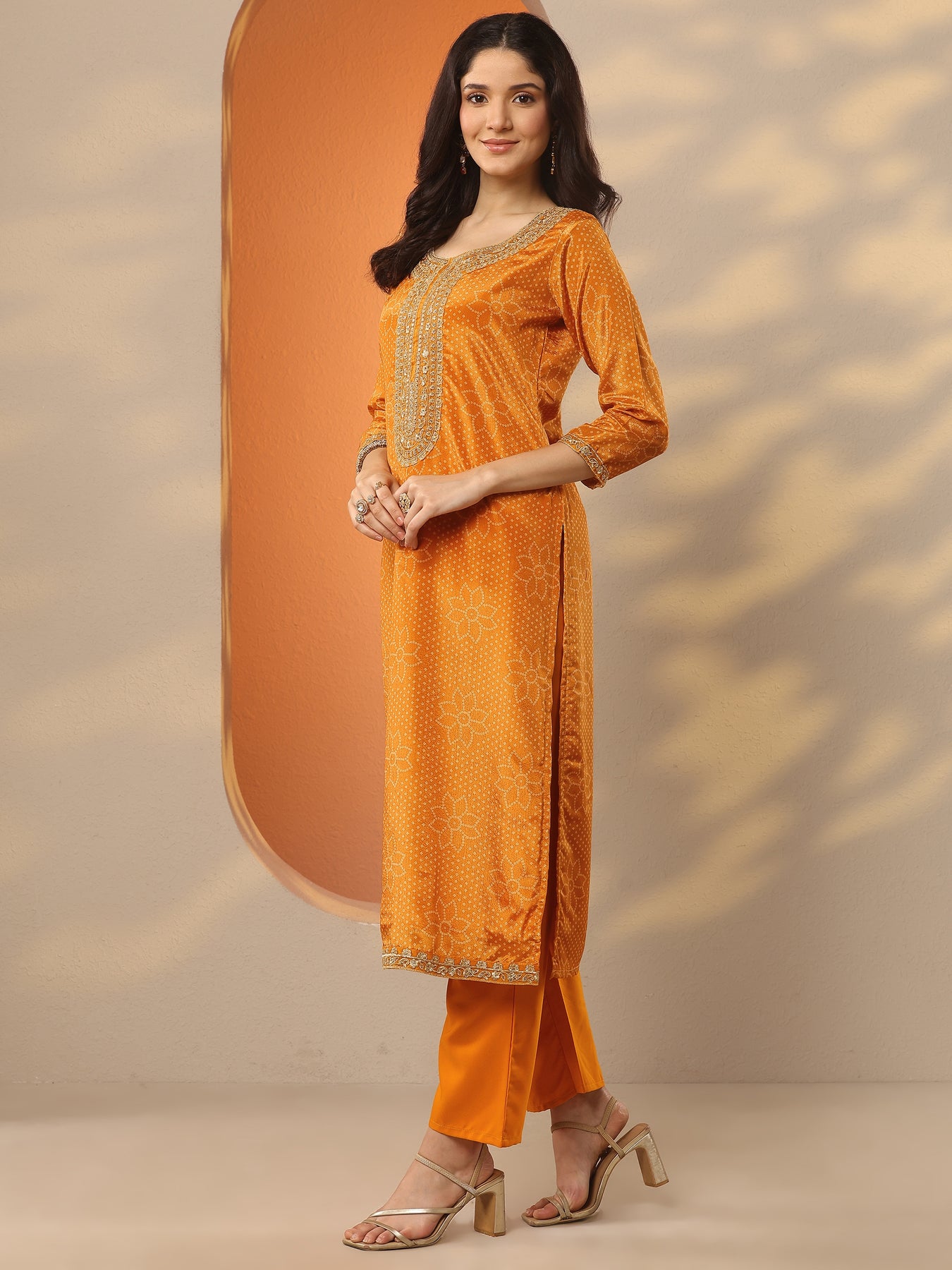 Mustard Printed Silk Blend Straight Suit Set With Dupatta