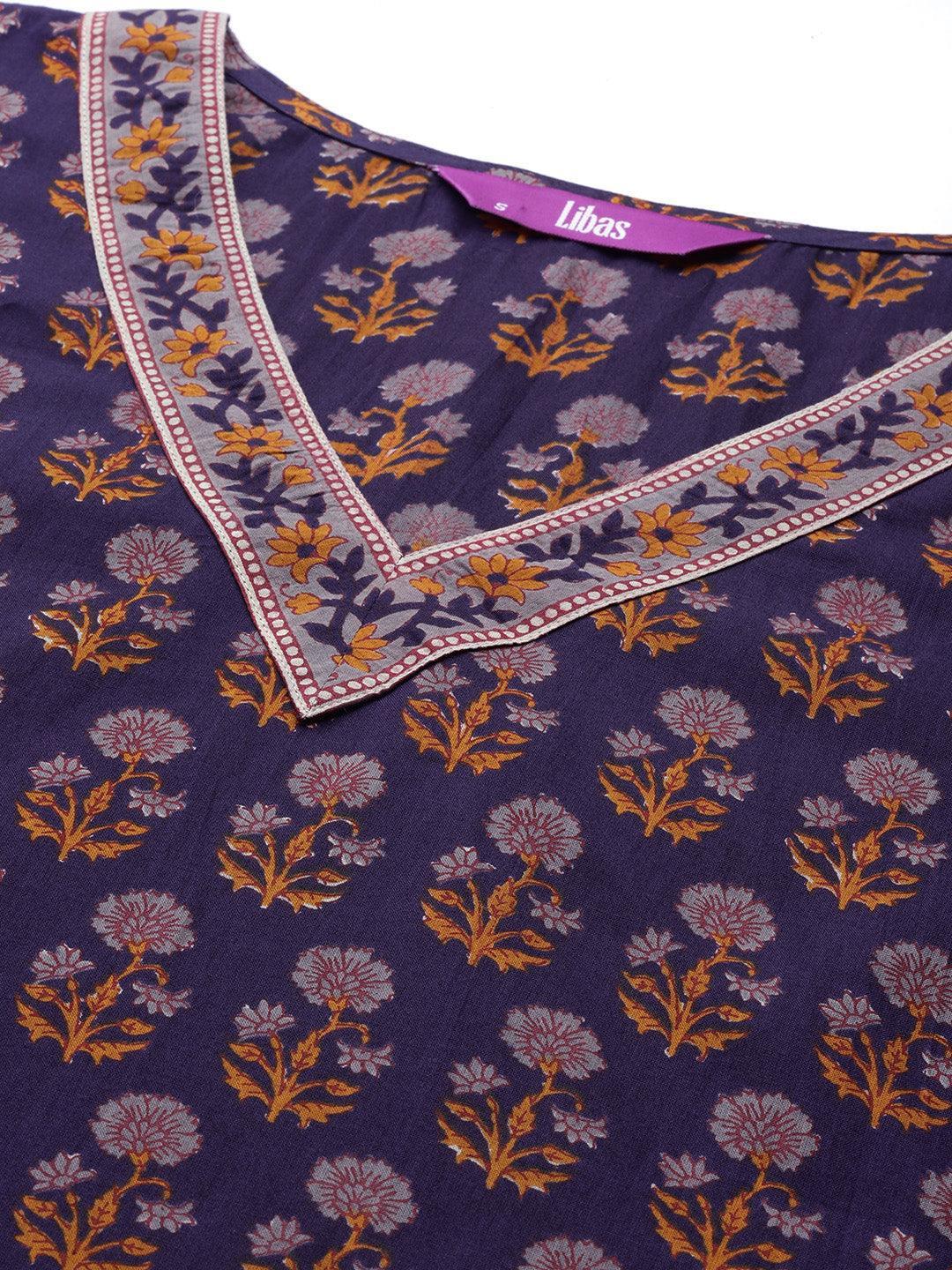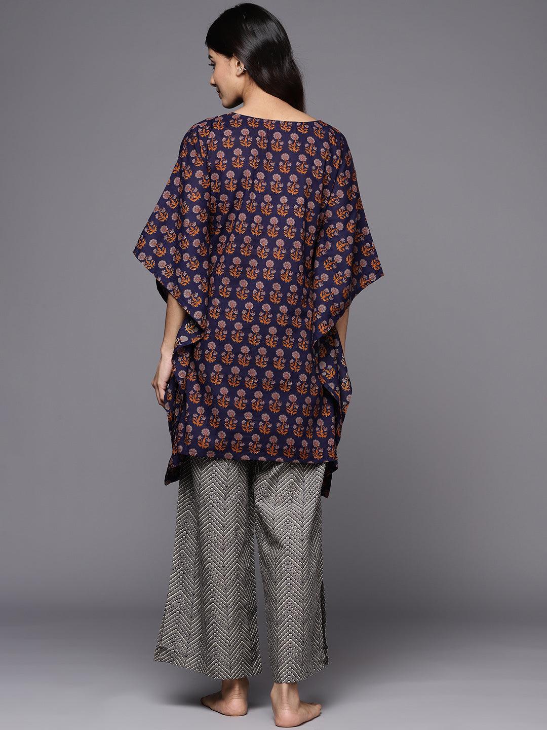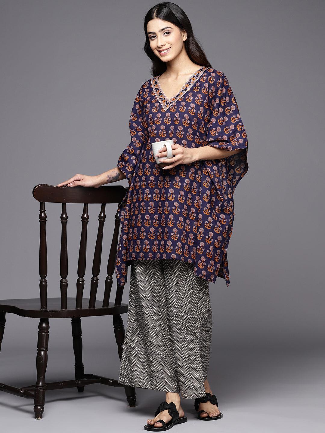 Our 2-piece cotton night suit set features a navy blue floral print kaftan kurti with a V-neckline and wide, loose-fitted sleeves. Complemented with chevron print flared pyjama pants with a partially elasticated waistband, roomy pockets, and stylish side-slits. Adorned with fabric-trim accents, this comfortable style is ideal for effortless everyday wear.