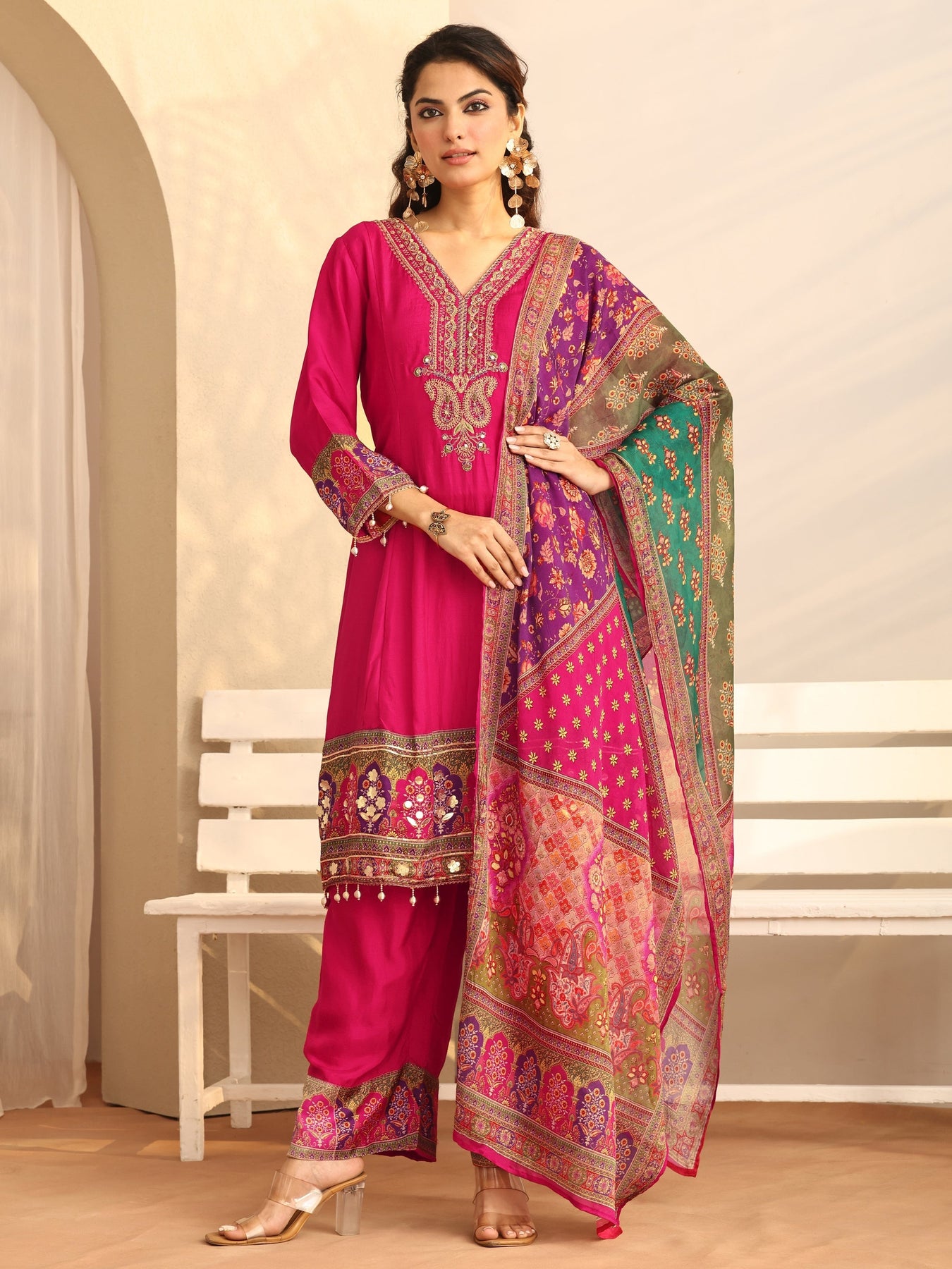 Pink Printed Silk Blend A-Line Suit Set With Dupatta