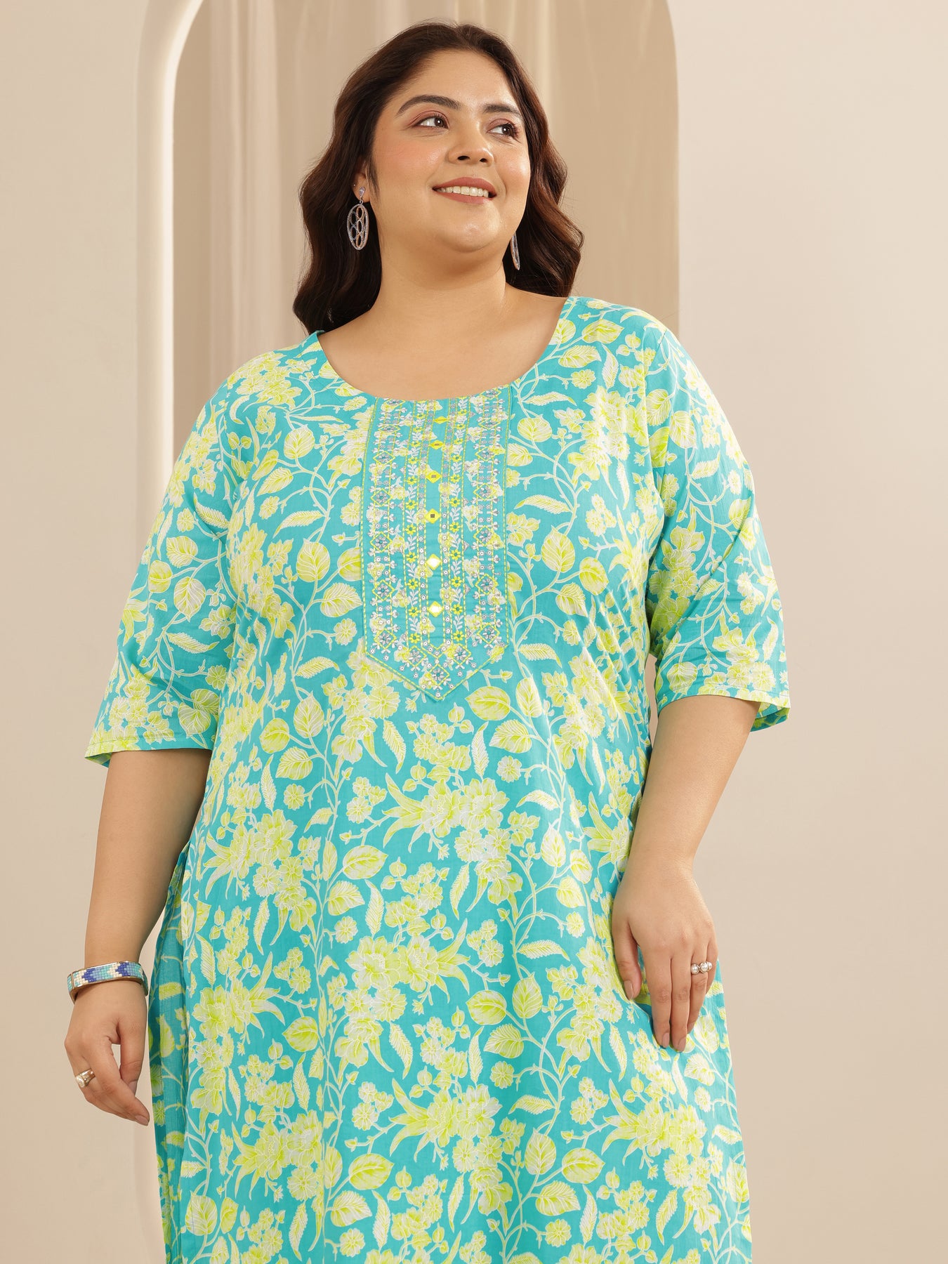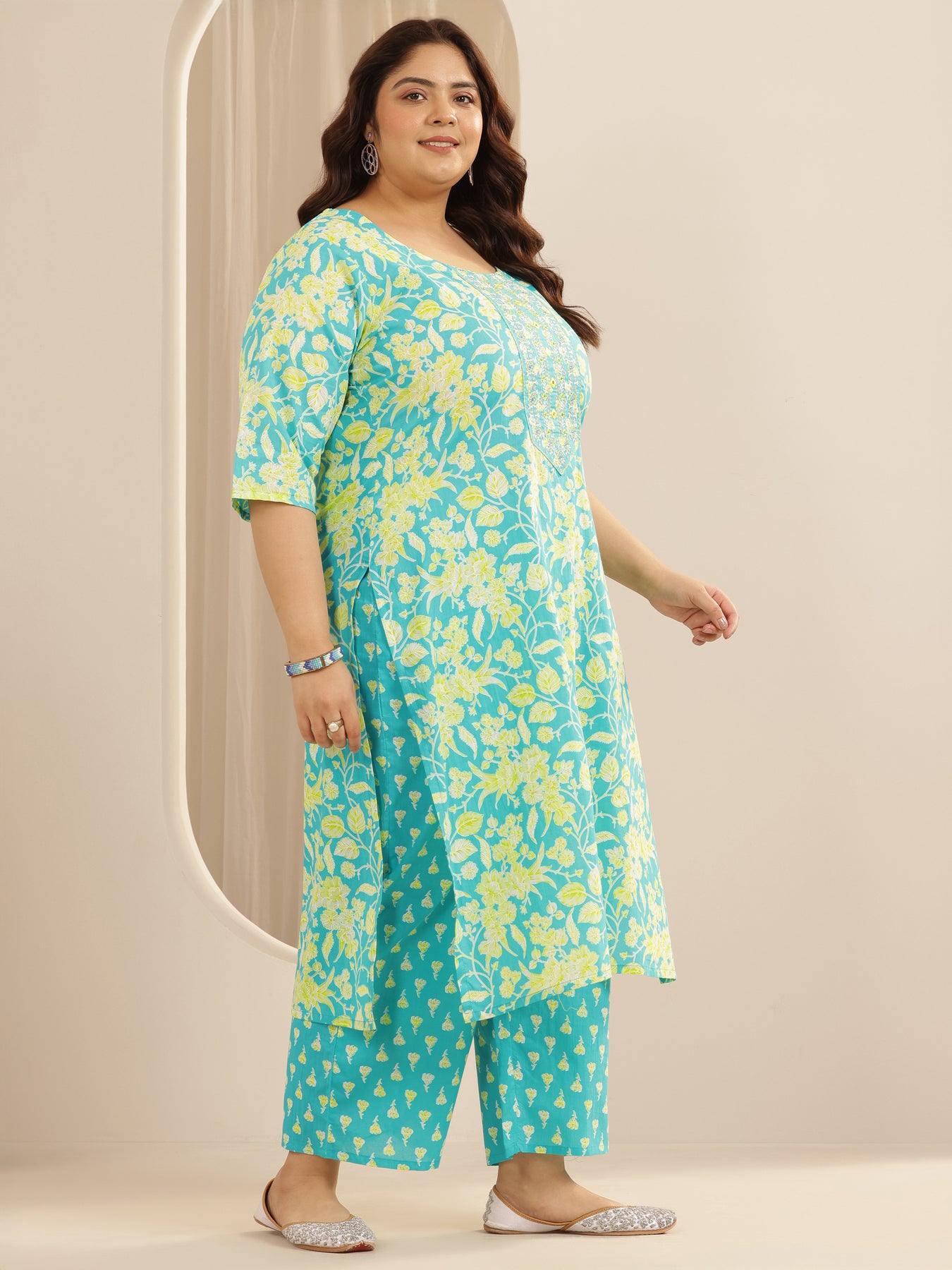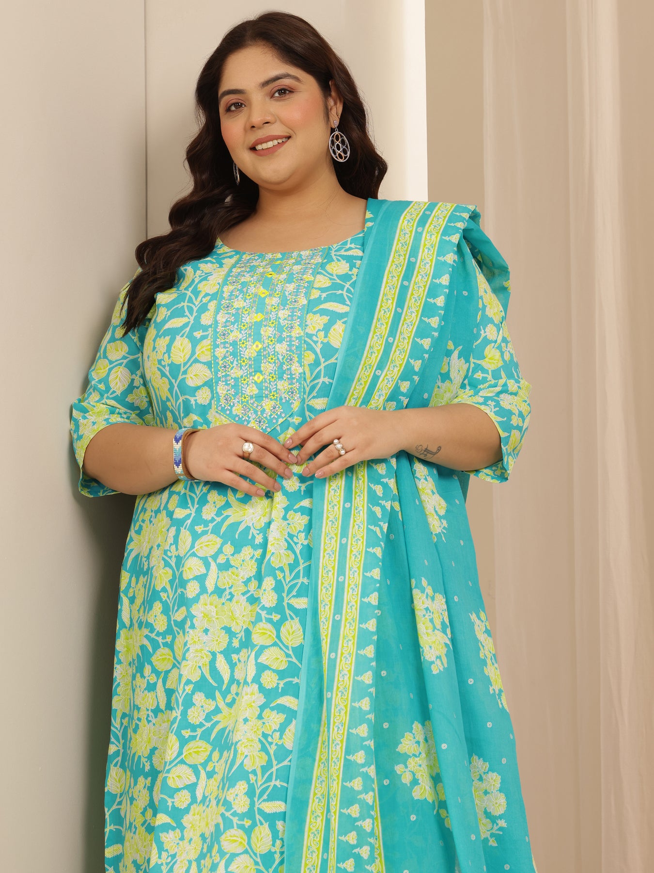 Libas Extra Love collection featuresOur signature designs in comfortable plus sizes.Our 3-piece Turquoise Blue Cotton Straight-Fit Kurta Set features a Round Neckline, Regular Sleeves, and statement yoke. Complemented with Straight Pants with a Partially Elasticated waistband and 2 pockets, and a Printed dupatta. Adorned with Floral Printed accents, this style is perfect for Casual Wear.