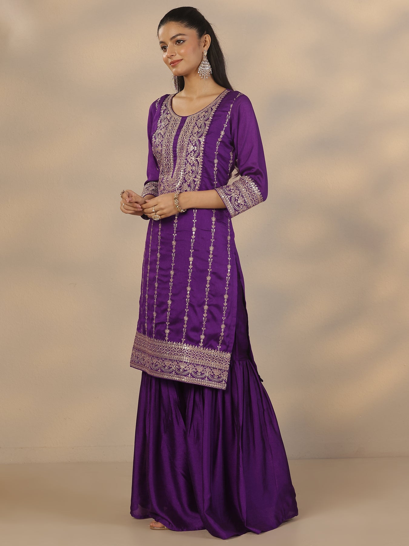 Purple Embroidered Silk Blend Straight Suit Set With Dupatta