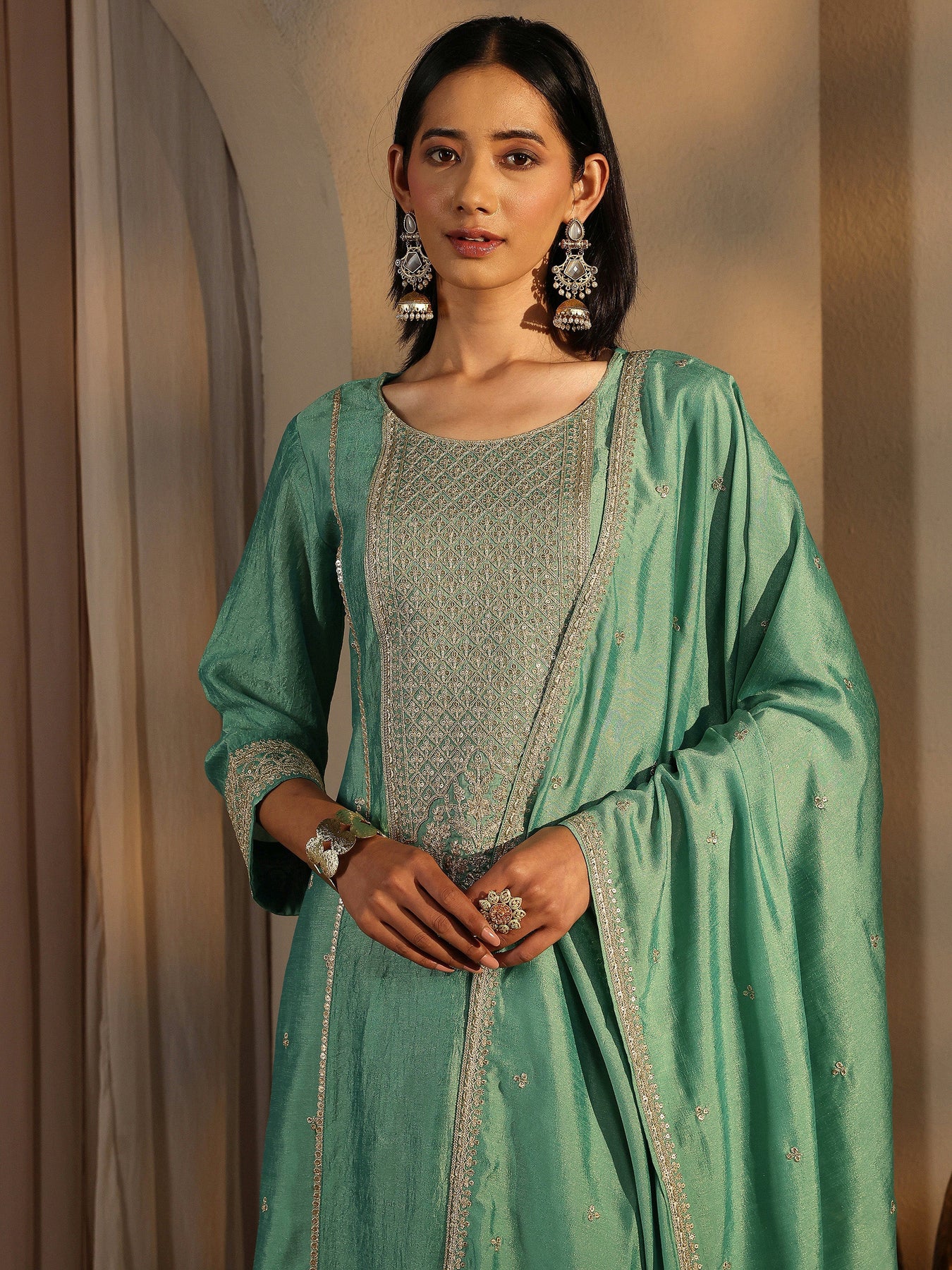 Sea Green Embroidered Silk Blend Straight Suit Set With Dupatta