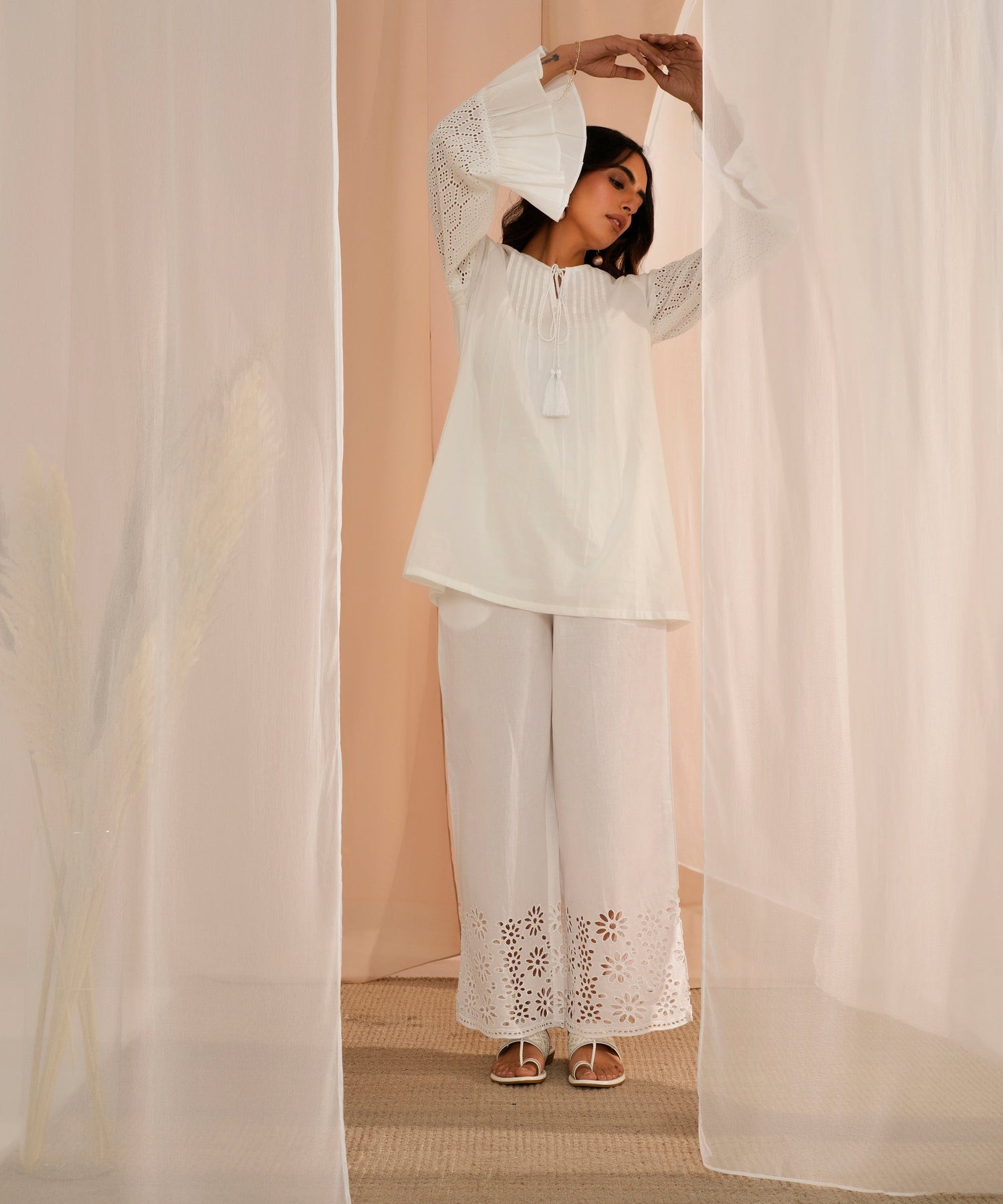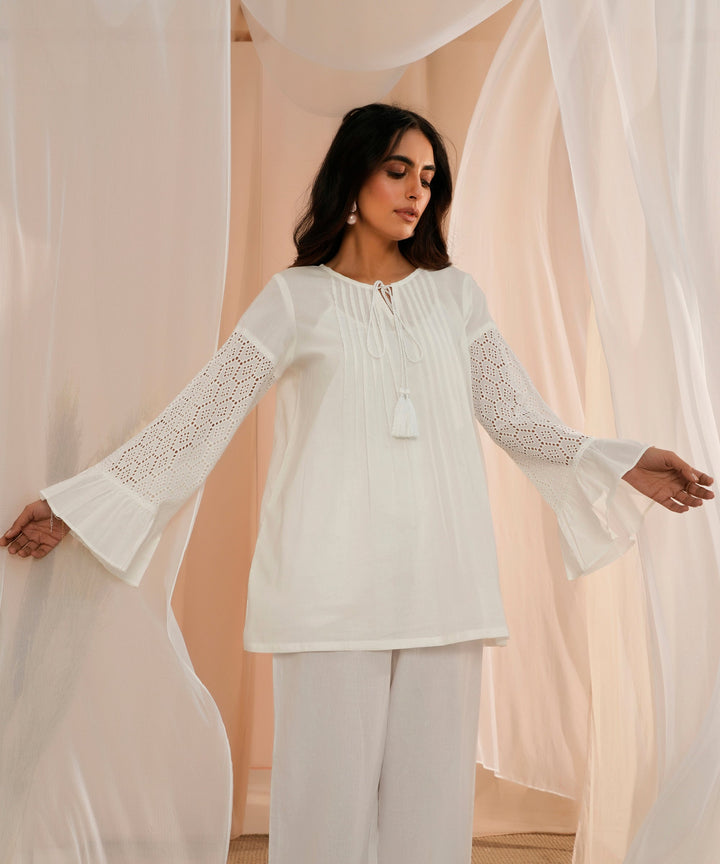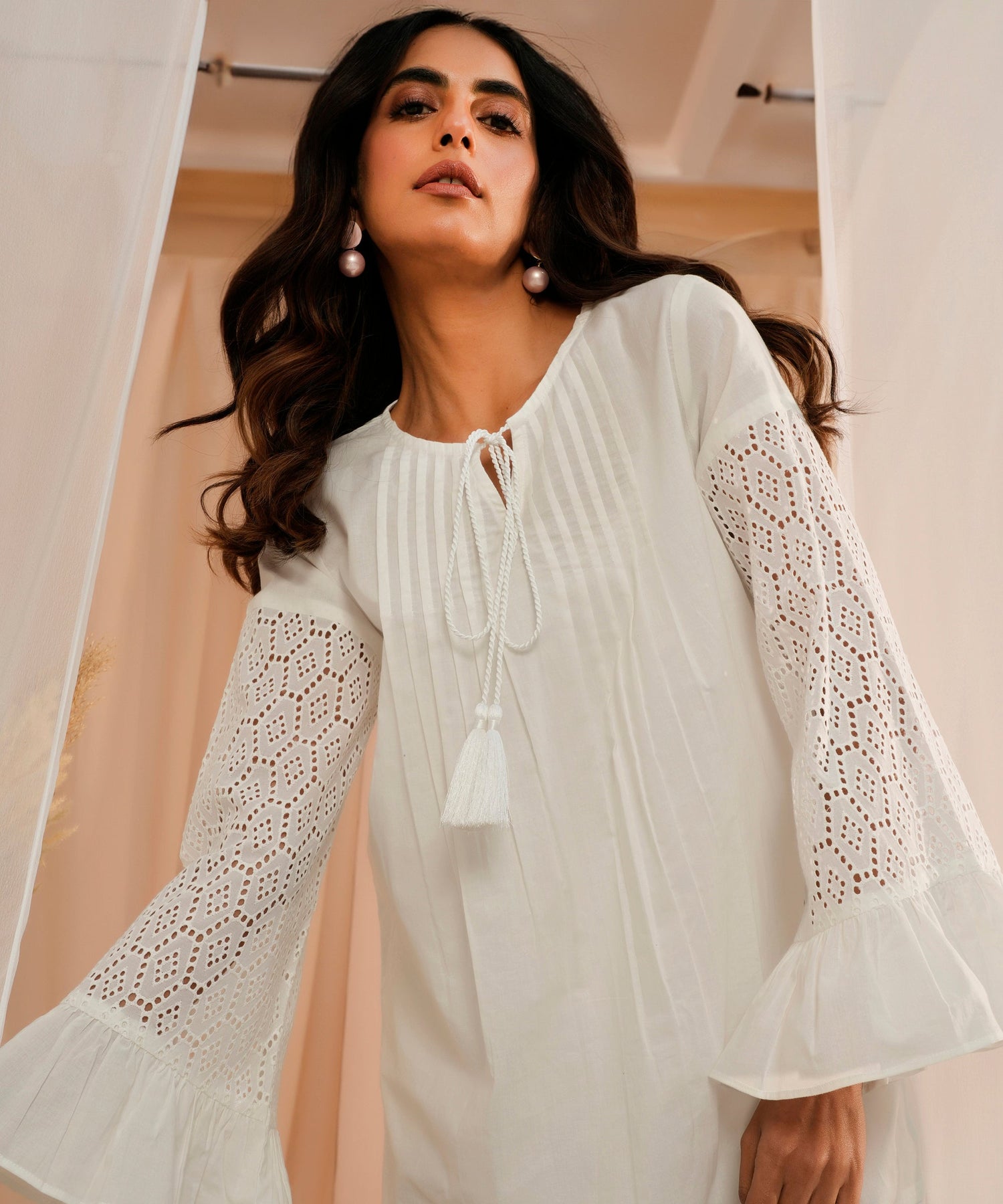 Our white cotton straight-fit kurti features a notched neckline with tie-up detailing and statement bell sleeves. Highlighted with schiffli detailing and dori-tassel work, this style is perfect for casual outings.